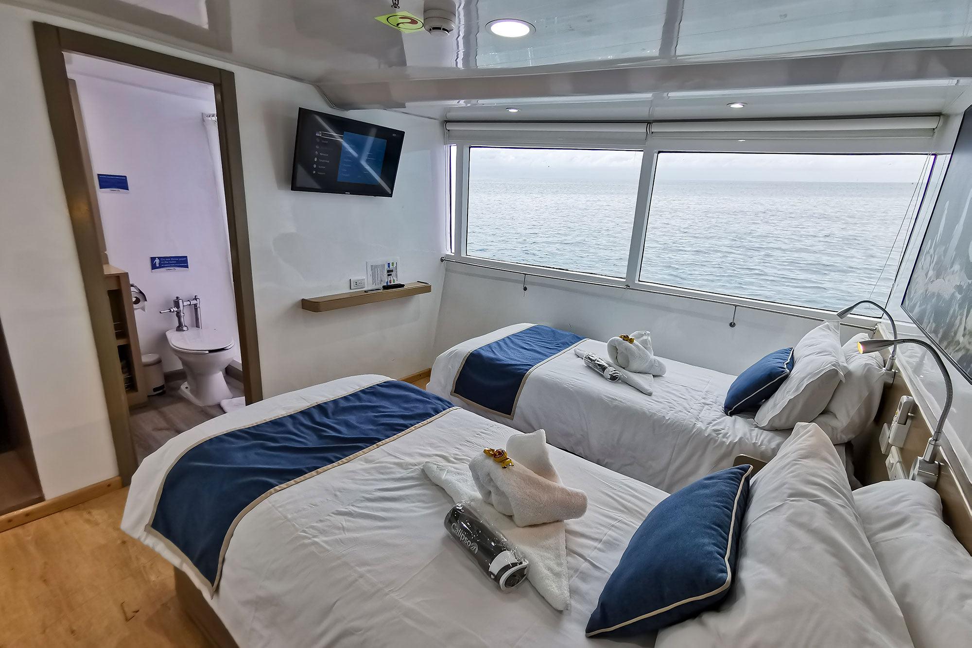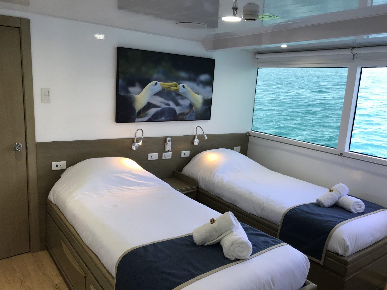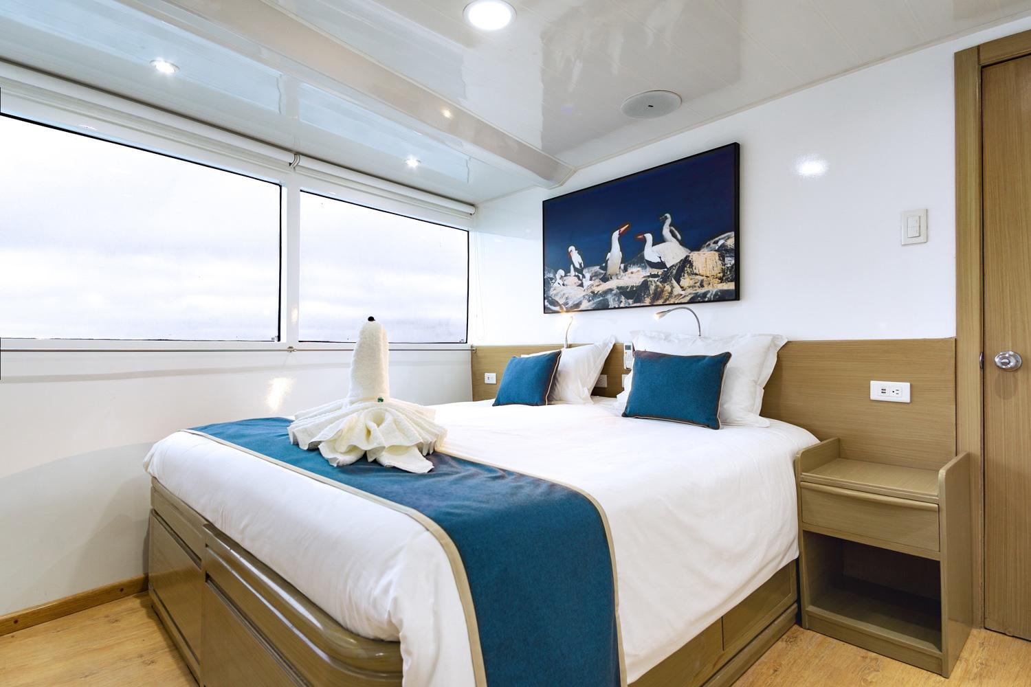 На борту могут разместиться 16 пассажиров. 6 двухместных кают расположены на верхней палубе, еще две - на главной. Каюты оборудованы двумя отдельными кроватями, которые могут быть трансформированы в одну двуспальную. Все каюты имеют окна, отдельную ванную комнату с душем, индивидуальный климат-контроль, Apple TV, фен, сейф и розетки USB. Каюты на верхней палубе имеют панорамные окна.