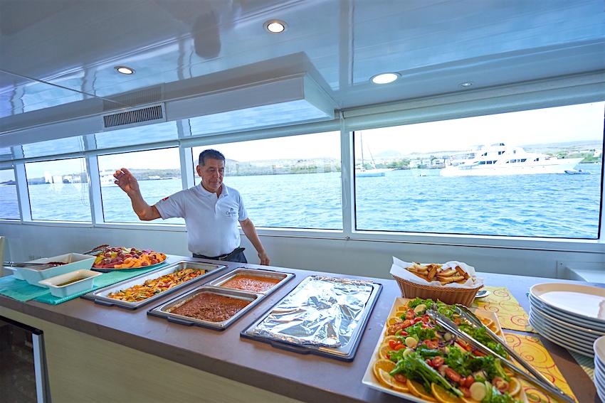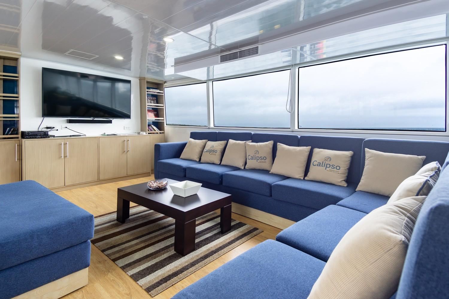 На главной палубе Calipso расположена просторная обеденная зона открытой планировки, где сервируется шведский стол, и салон с большими окнами, откуда открывается прекрасный вид.