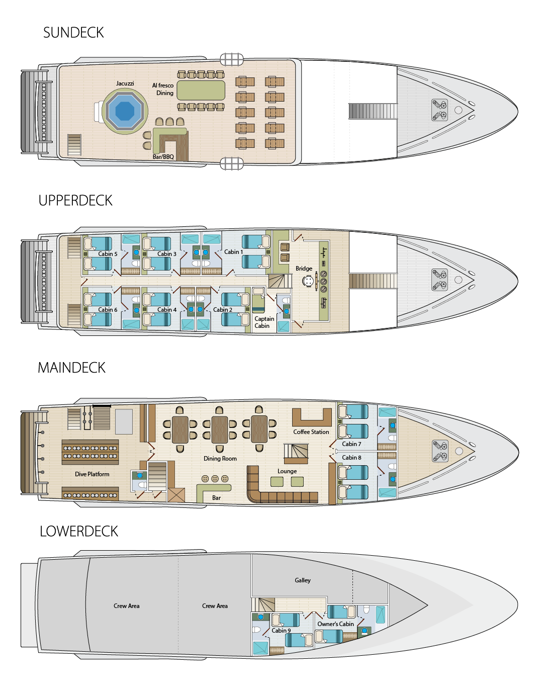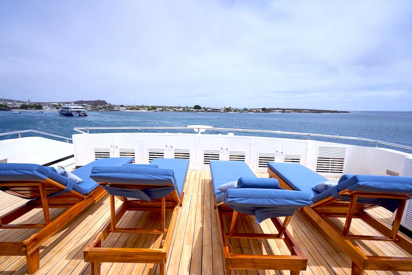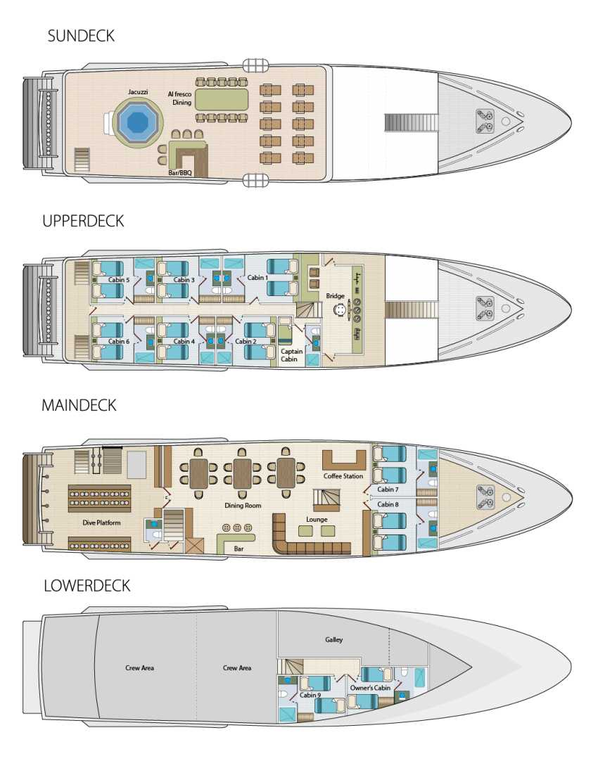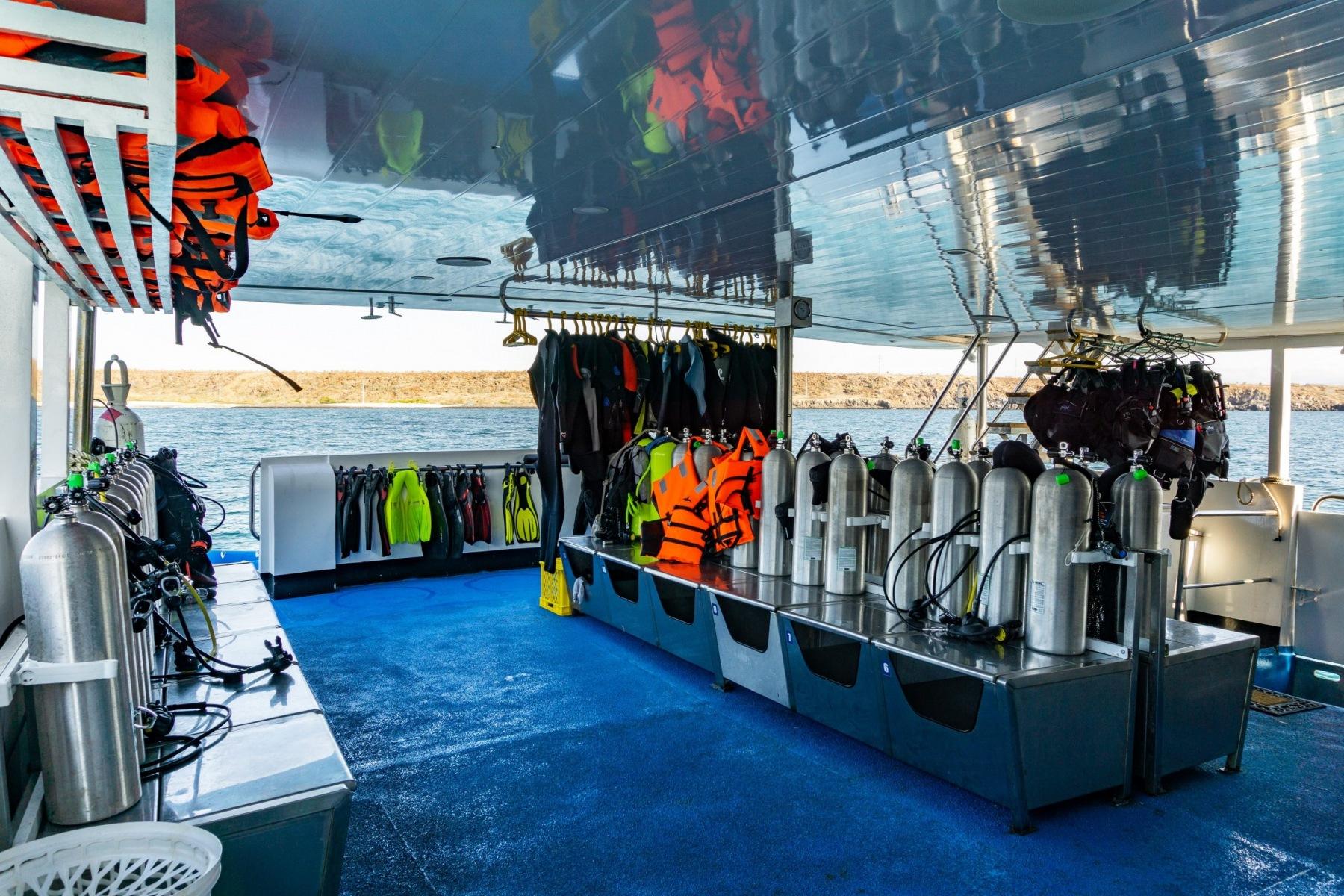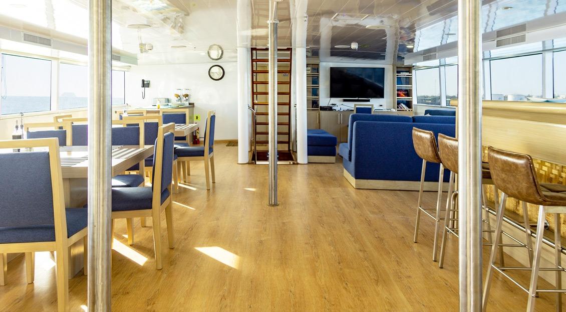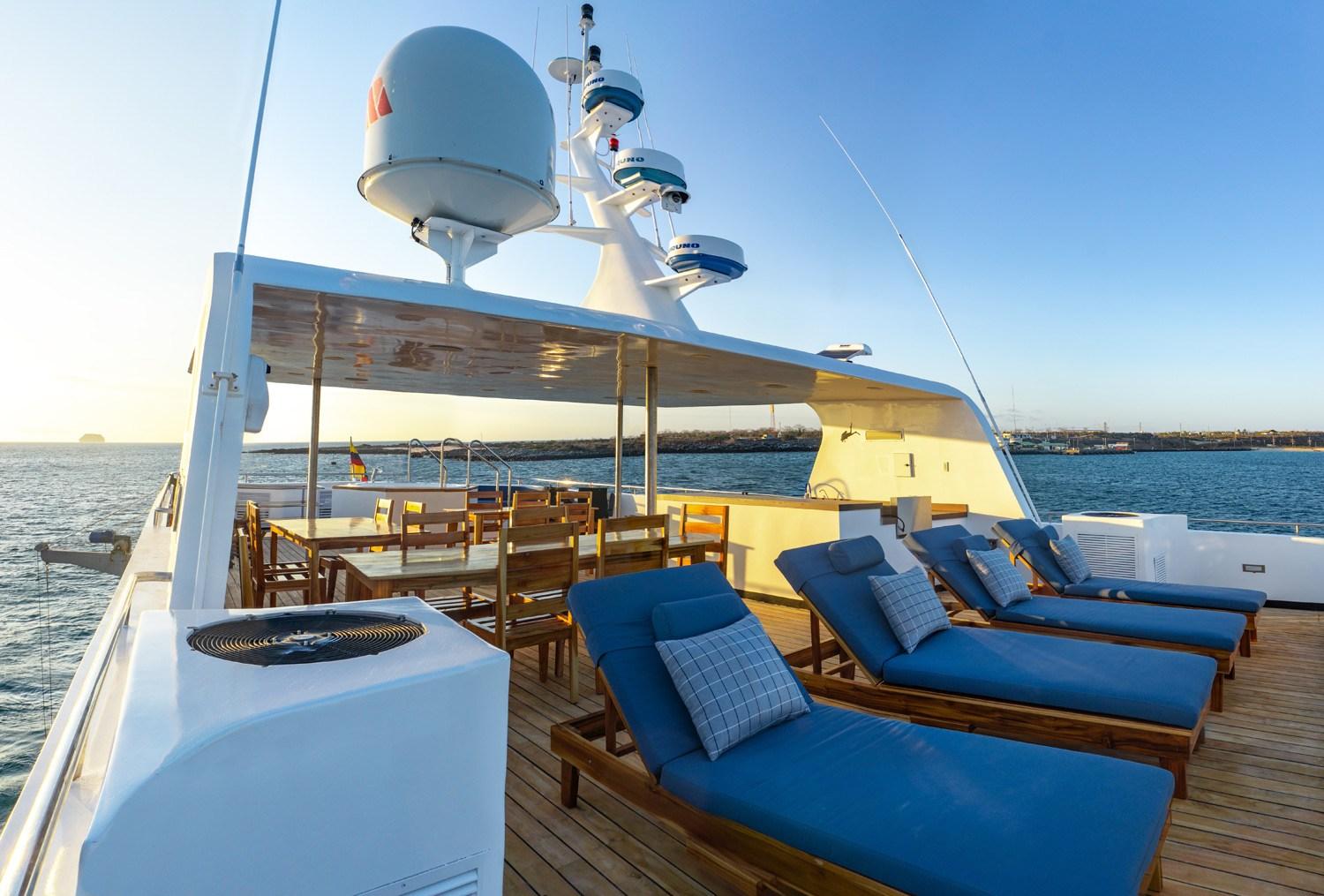На сан-деке находятся мягкие шезлонги для отдыха между погружениями, джакузи, бар и зона барбекю. На дайв-деке есть зона с зарядными станциями и большим удобным столом, а также двухуровневый бак для промывки оборудования и душ с пресной водой.