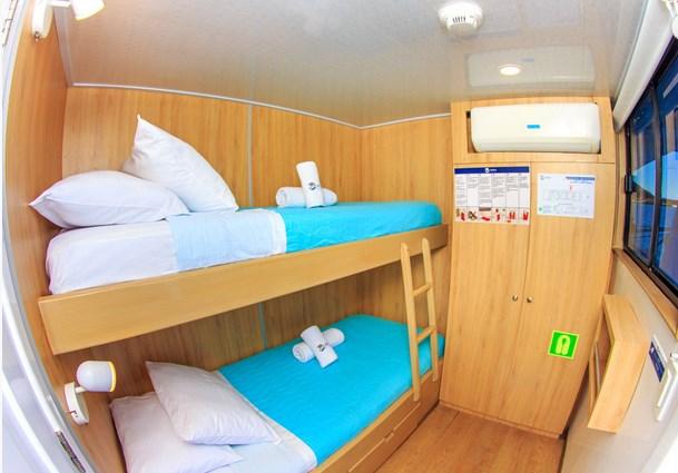 На нижней палубе расположены 3 каюты с двумя двухъярусными кроватями. На главной палубе находится 1 каюта с двуспальной кроватью. 1 каюта с двуспальной кроватью и 4 с двумя двухъярусными кроватями находятся на верхней палубе. Каюты на главной и верхней палубах имеют панорамные окна.