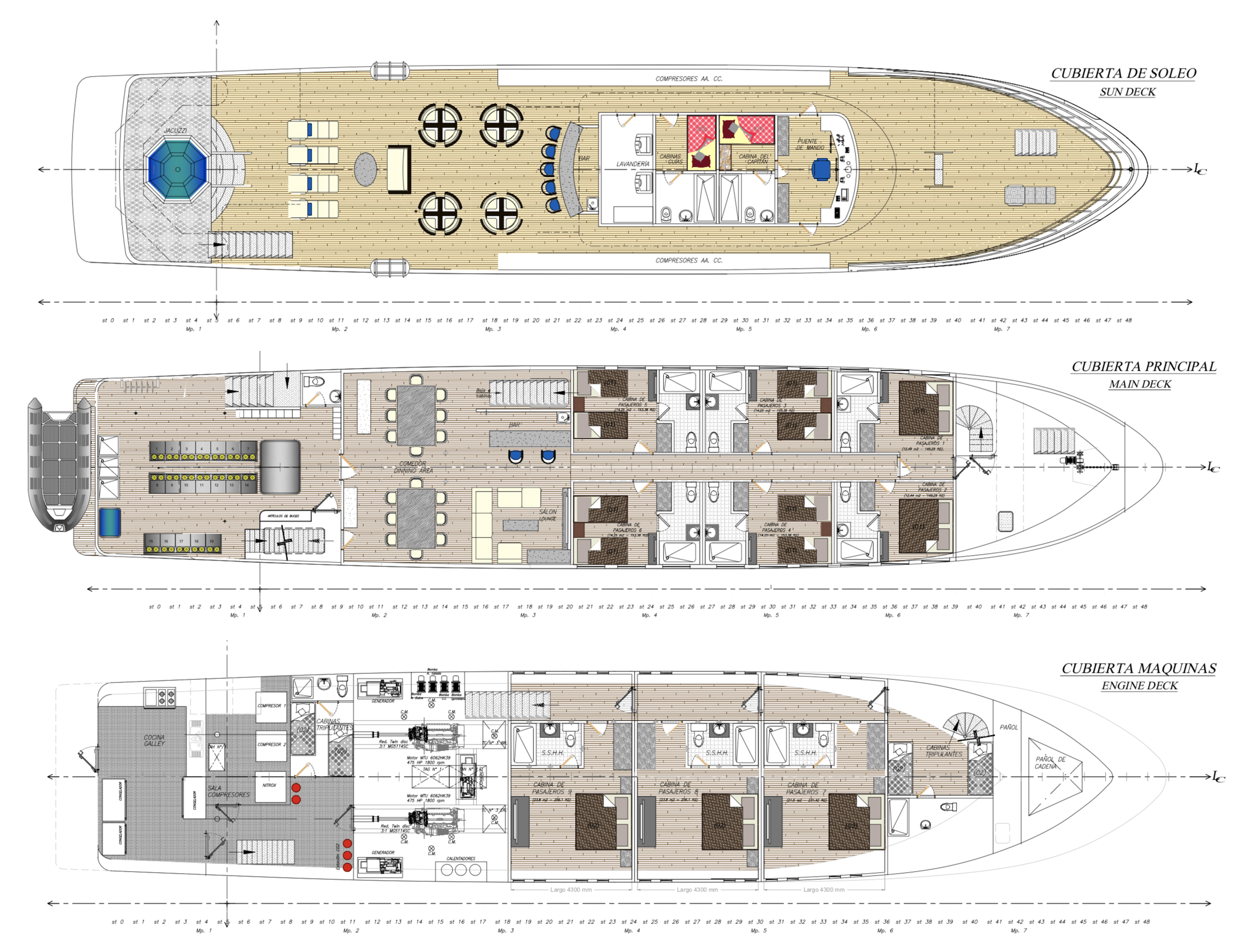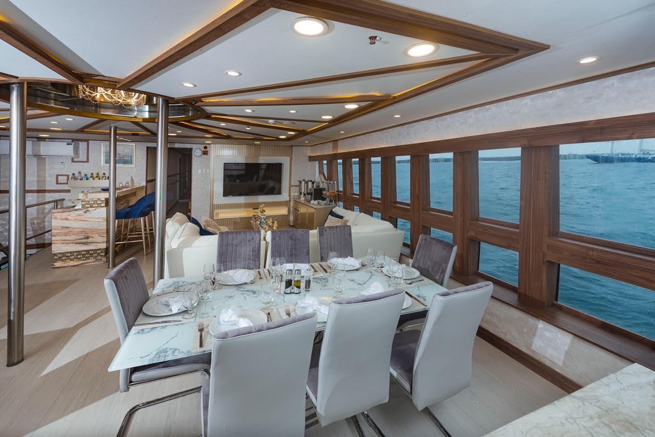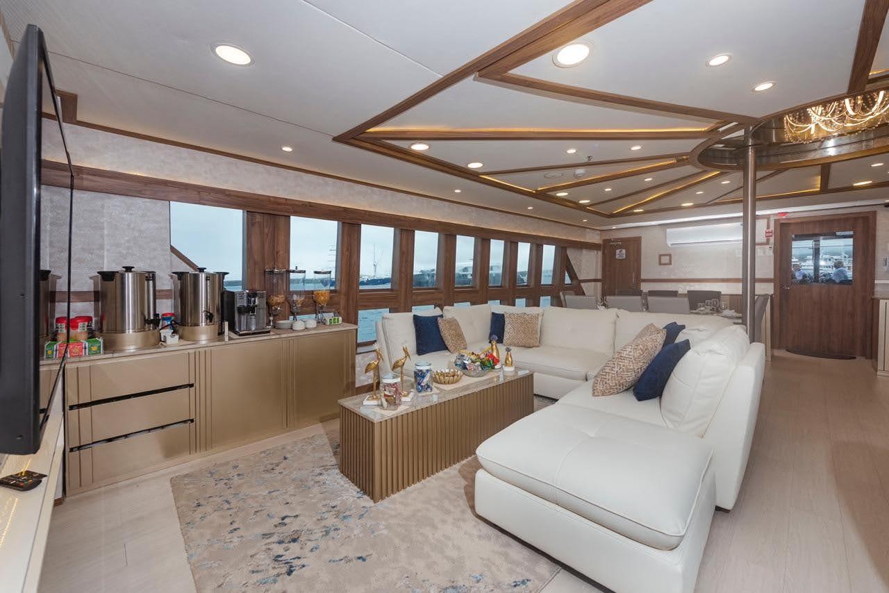 У двох каютах, що розташовані на головній палубі, є двоспальні ліжка. У всіх інших каютах по два окремі ліжка, які на запит можуть бути замінені на двоспальне. Яхта має частково критий сан-дек із джакузі та великою кількістю місць для відпочинку, а також розкішний салон з обідньою зоною, баром та зоною розваг.