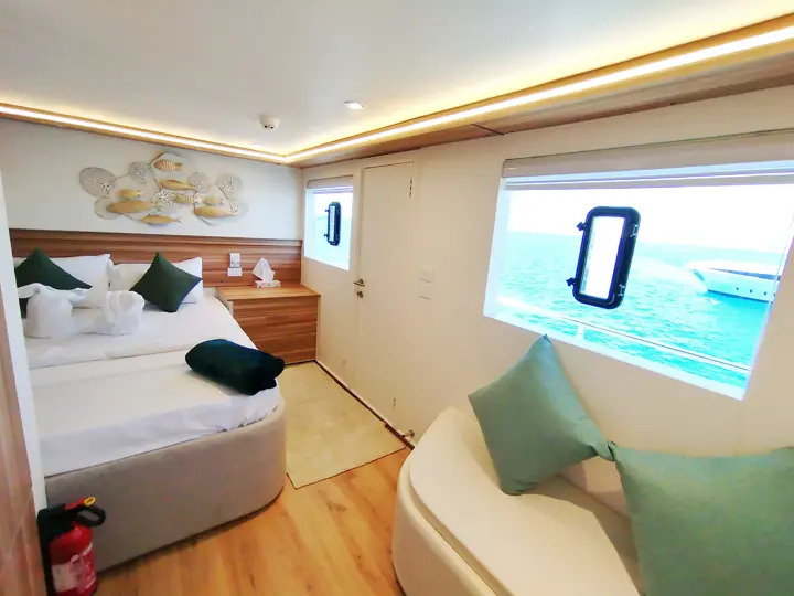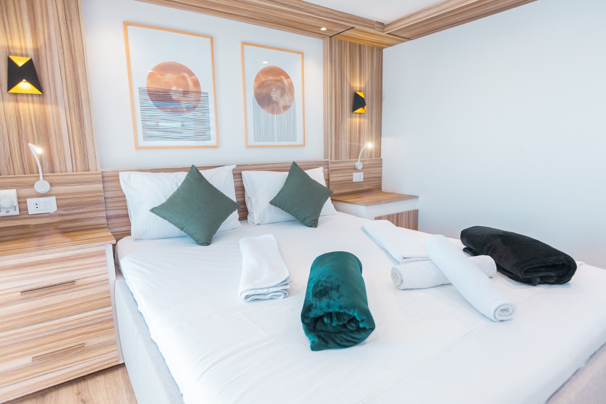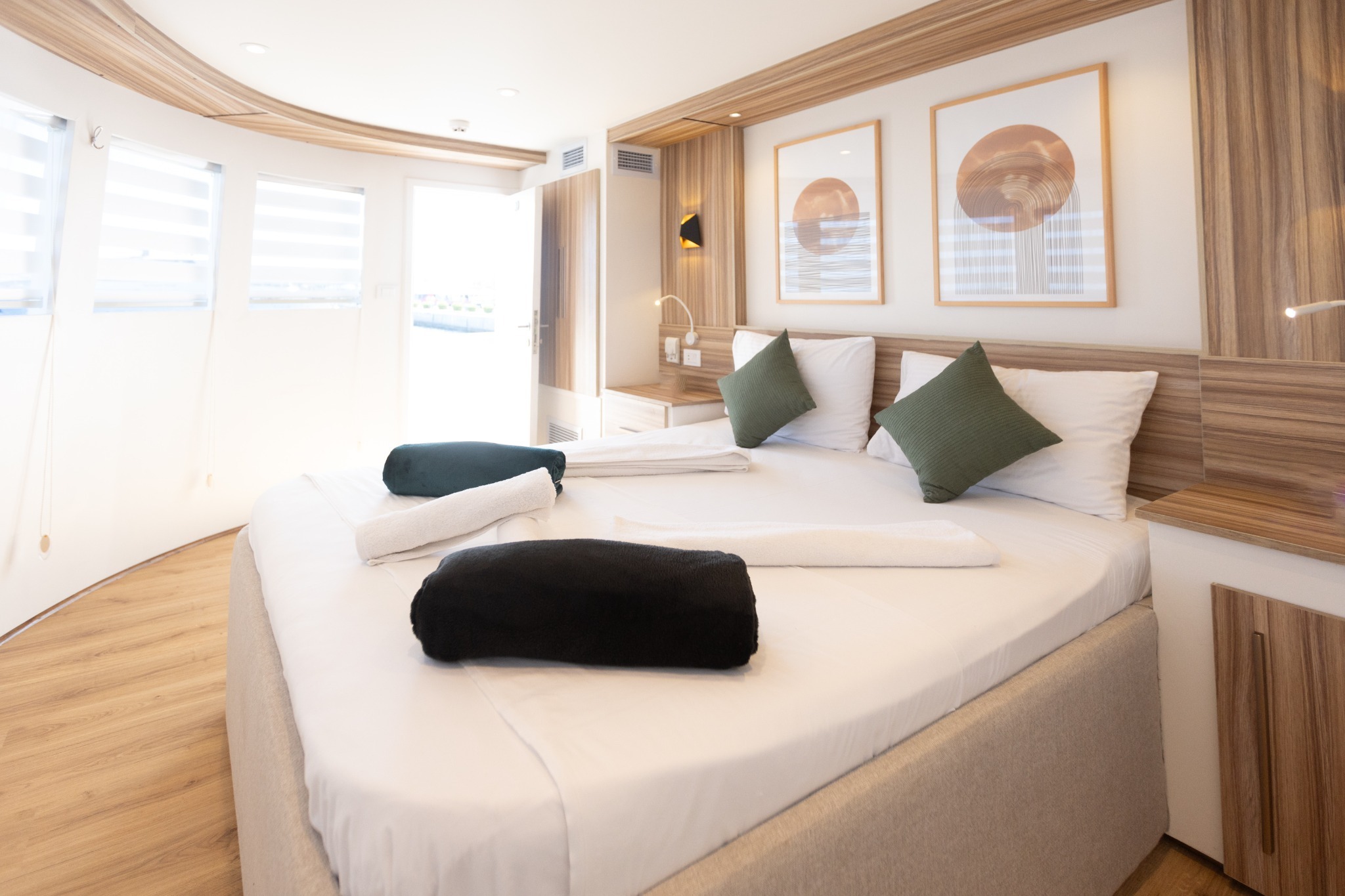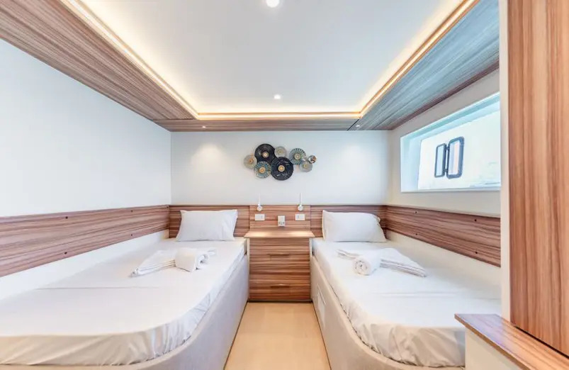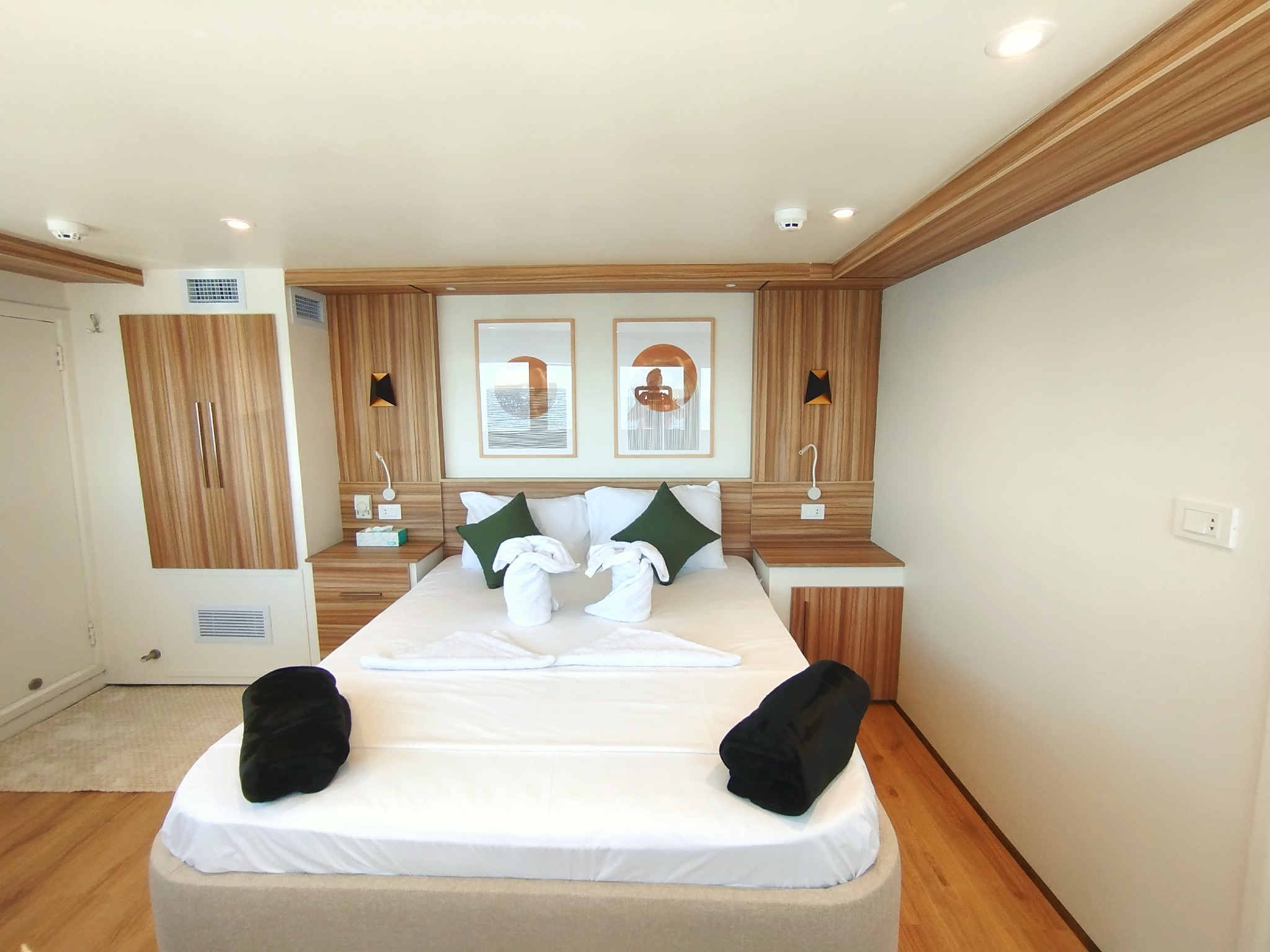 Каюти розташовані на кількох палубах і підходять для різних форматів розміщення. На головній палубі знаходяться чотири каюти з двома односпальними ліжками поруч із дайв-платформою та салоном. На верхній палубі розміщені одна каюта-сьют, чотири каюти з односпальними ліжками та каюта з двоярусним ліжком, а також бар і зона відпочинку з лежаками. На сонячній палубі розташовані два просторі сьюти з двоспальними ліжками, що забезпечують більше приватності та швидкий доступ до відкритих лаунж-зон. Усі каюти обладнані індивідуальним кондиціонером і власною ванною кімнатою.