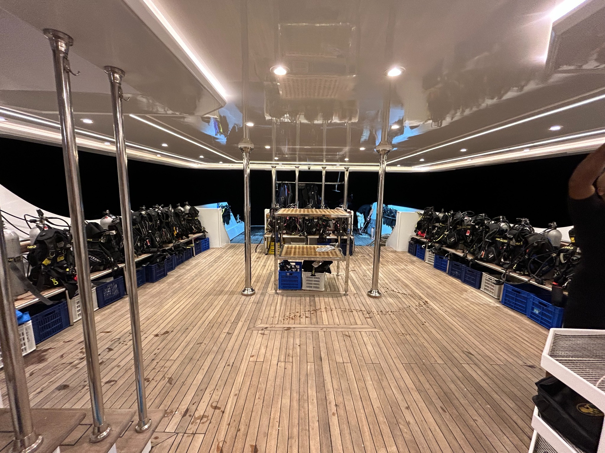 Дайв-палуба простора та функціональна. Вона має прямий вихід із салону та обладнана окремою зоною для камер і зарядними станціями. На борту працюють два компресори Bauer K150 і система Nitrox NRC, що забезпечує стабільну організацію щоденних занурень. Є зручні місця для підготовки та промивання спорядження між дайвами.