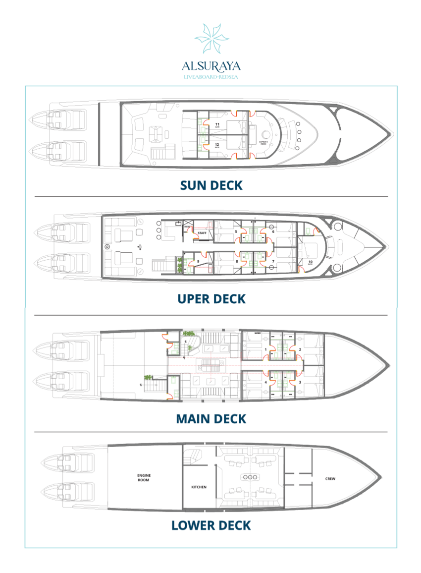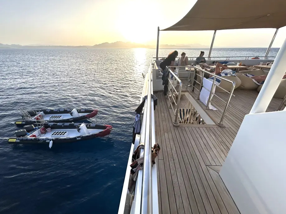 Для дайвінгу доступна оренда повного комплекту спорядження, включно з 15-літровими балонами та sidemount. Підтримку занурень забезпечують два швидкісні човни. Триразове харчування включає повноцінні вечері з кількох страв і закуски між зануреннями. На борту доступні вода, чай, кава та безалкогольні напої, а пиво й вино можна придбати за додаткову плату. Alsuraya - це збалансоване поєднання надійного дайвінгу, комфорту та продуманого сервісу для насиченого дайвінг-сафарі в Червоному морі.