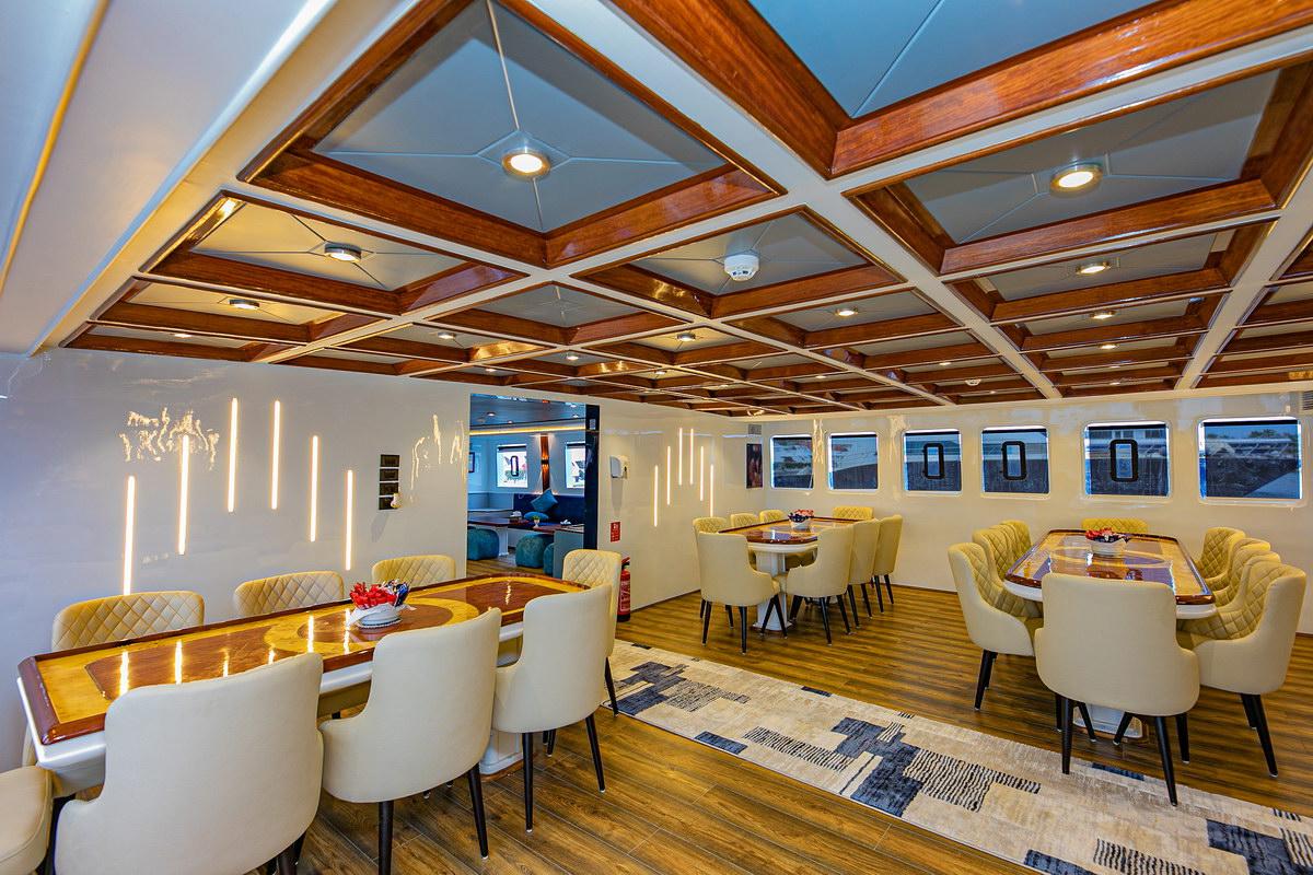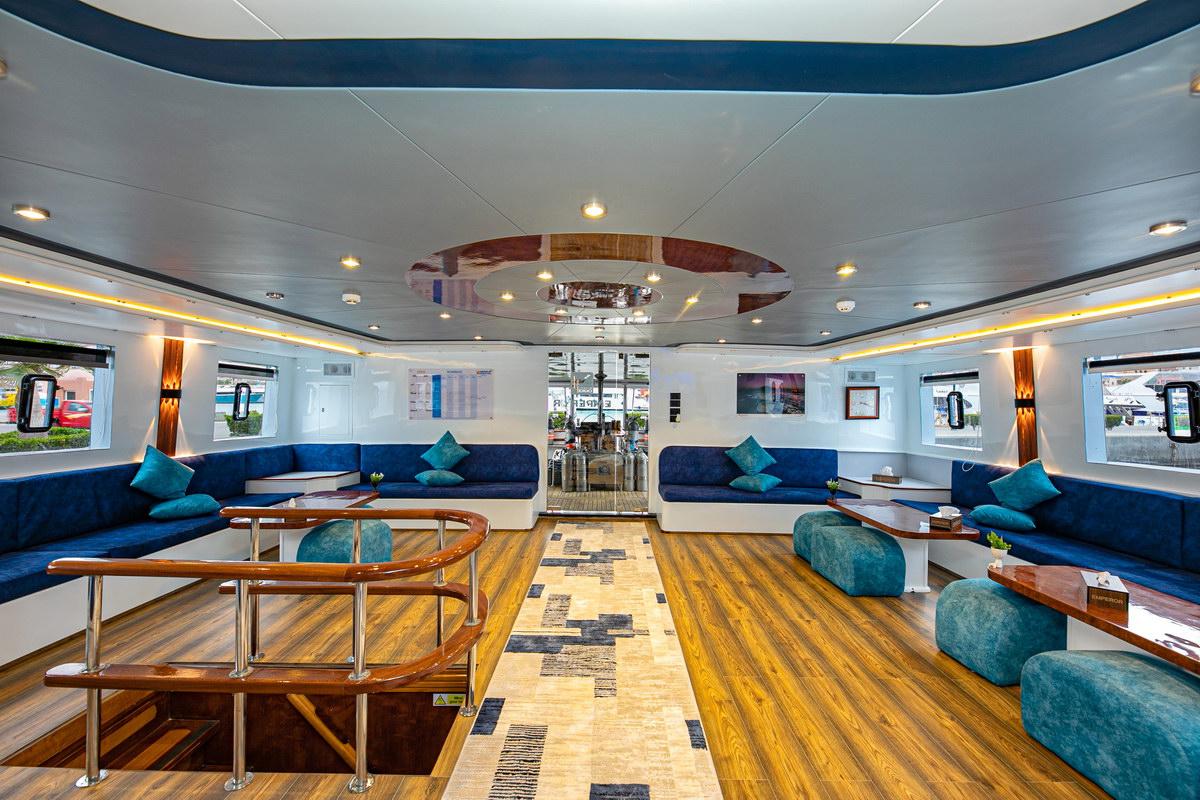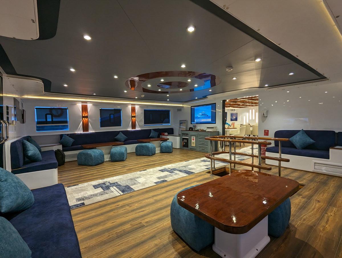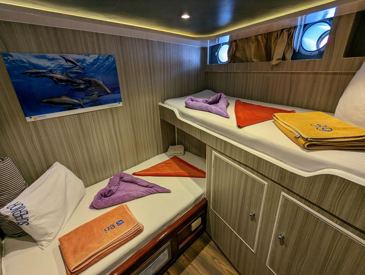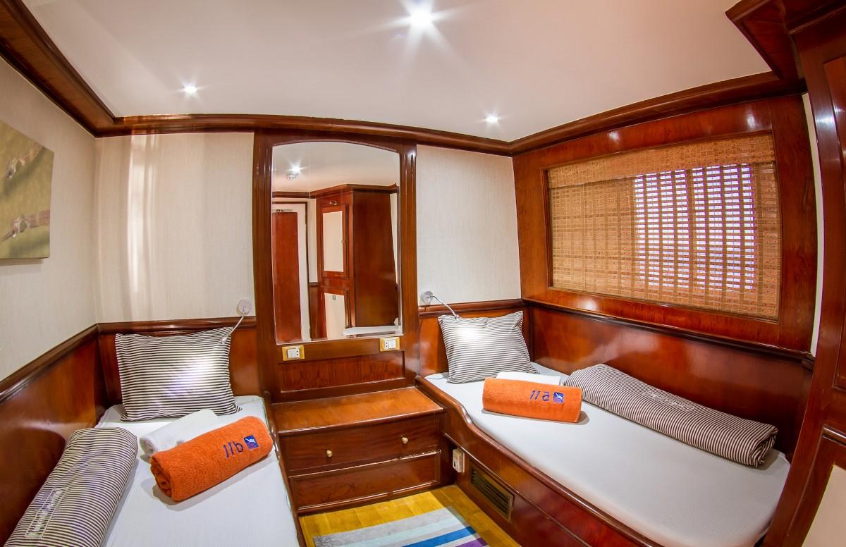На середній палубі знаходяться 2 каюти: одна з односпальним ліжком та одна з двома роздільними ліжками. На верхній палубі можна розміститися в каюті з двоспальним ліжком та в каюті з роздільними ліжками. У каютах є індивідуальні санвузли, кондиціонер та рушники. Розслабитися та відпочити після насиченого дня занурень пасажири зможуть у салоні яхти. А засмагати та насолоджуватися видом блакитного моря зручно на м'яких лежаках на верхній палубі.