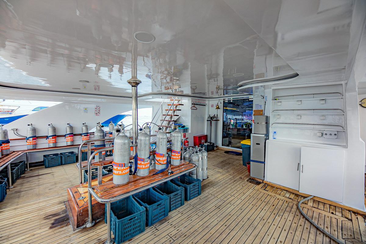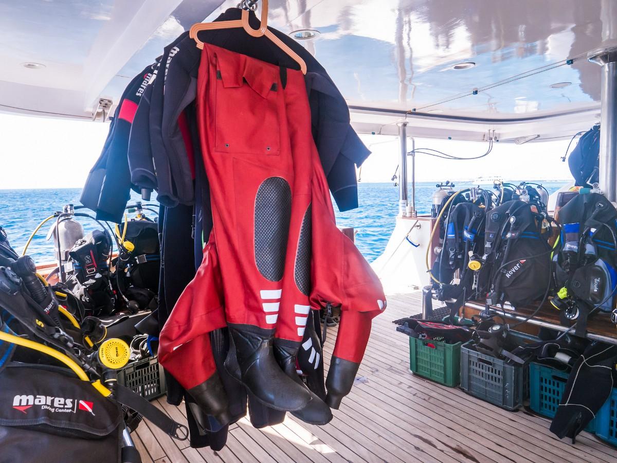 Для зберігання спорядження на борту яхти є спеціальні ящики, для гідрокостюмів – вішалки. Дайвери із сертифікатом EANx зможуть заправити балони найтроксом.
