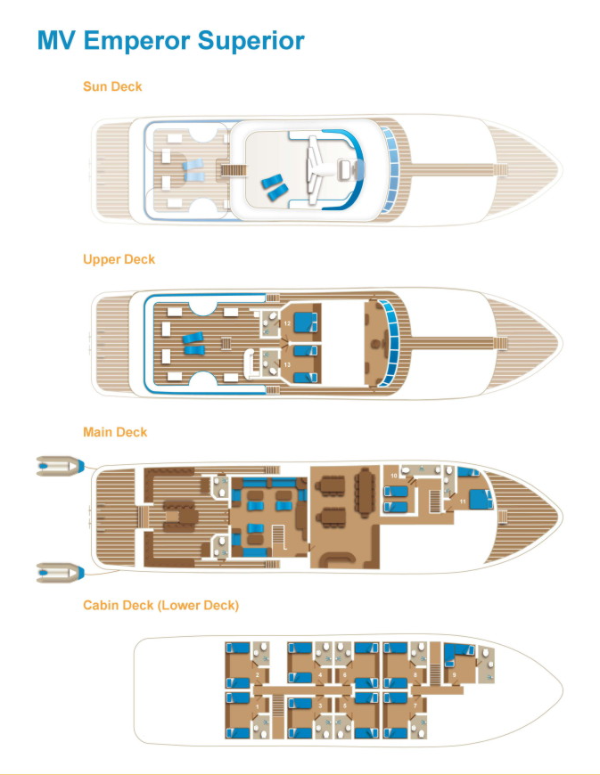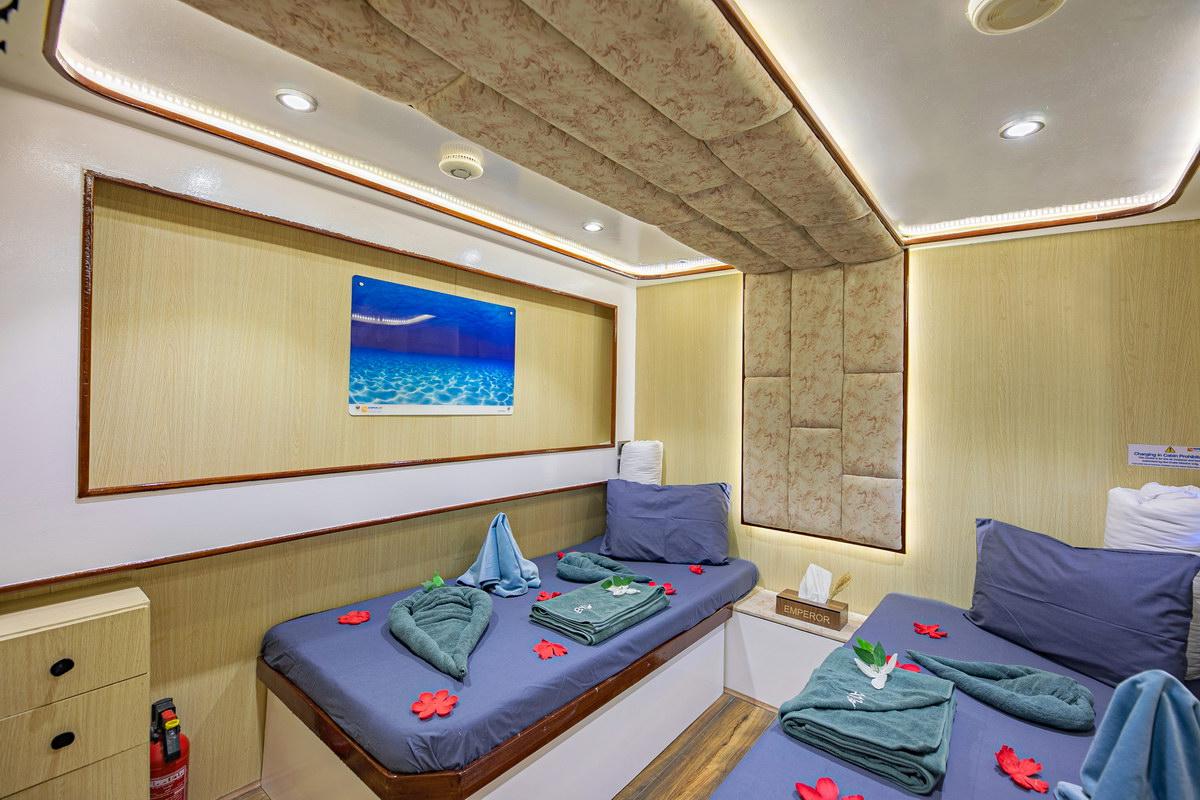 На борту Emperor Superior 13 кают, де можуть розміститися 26 гостей. На нижній палубі розташовані 9 кают із роздільними ліжками.