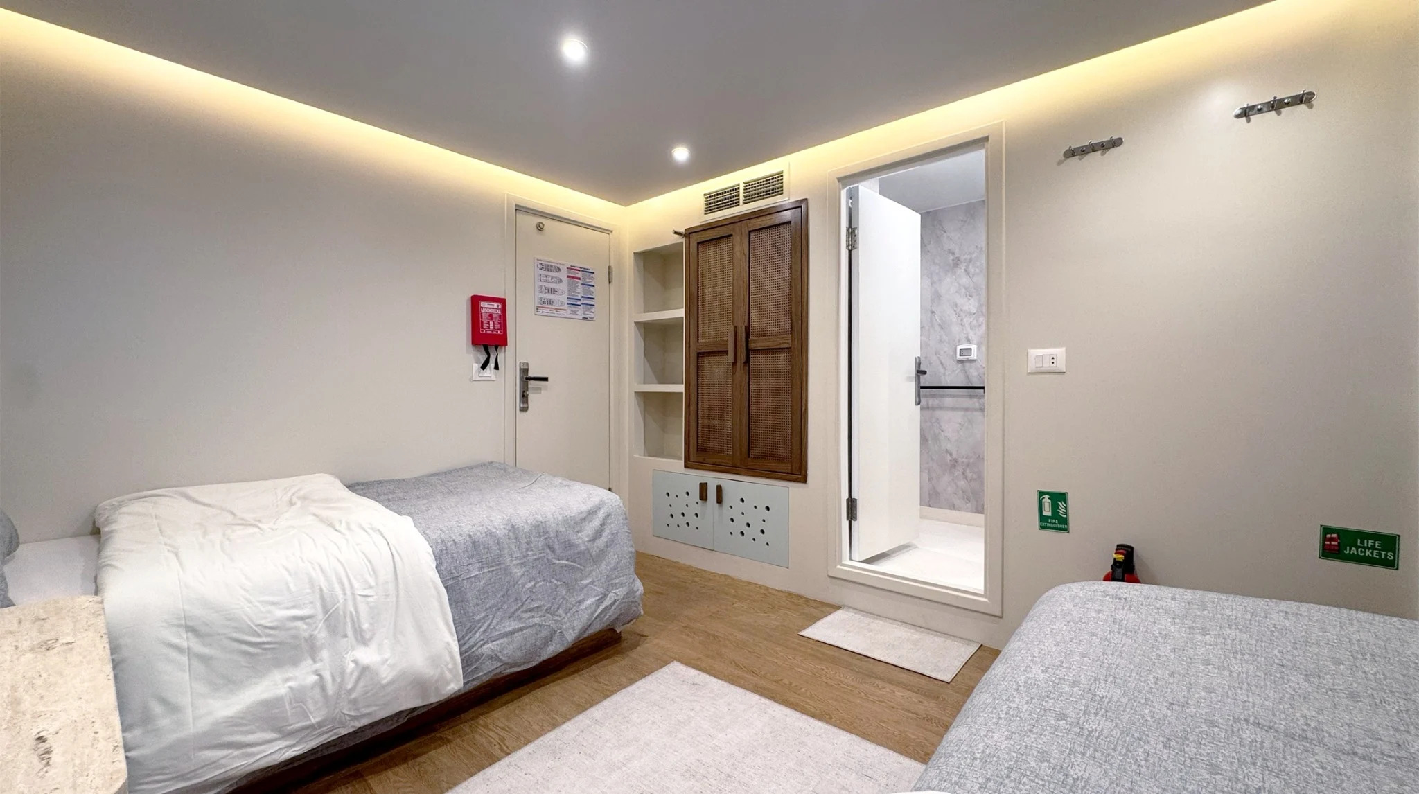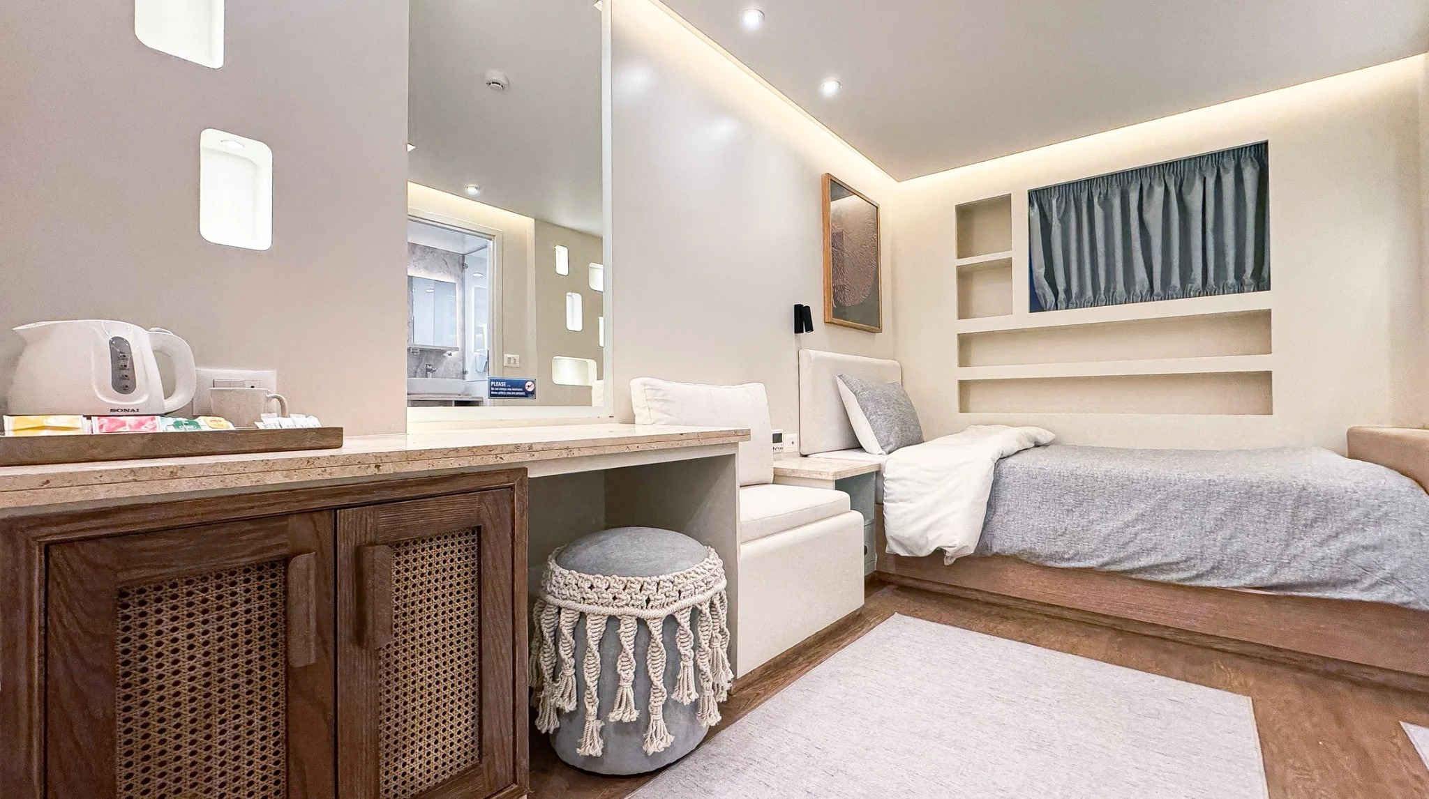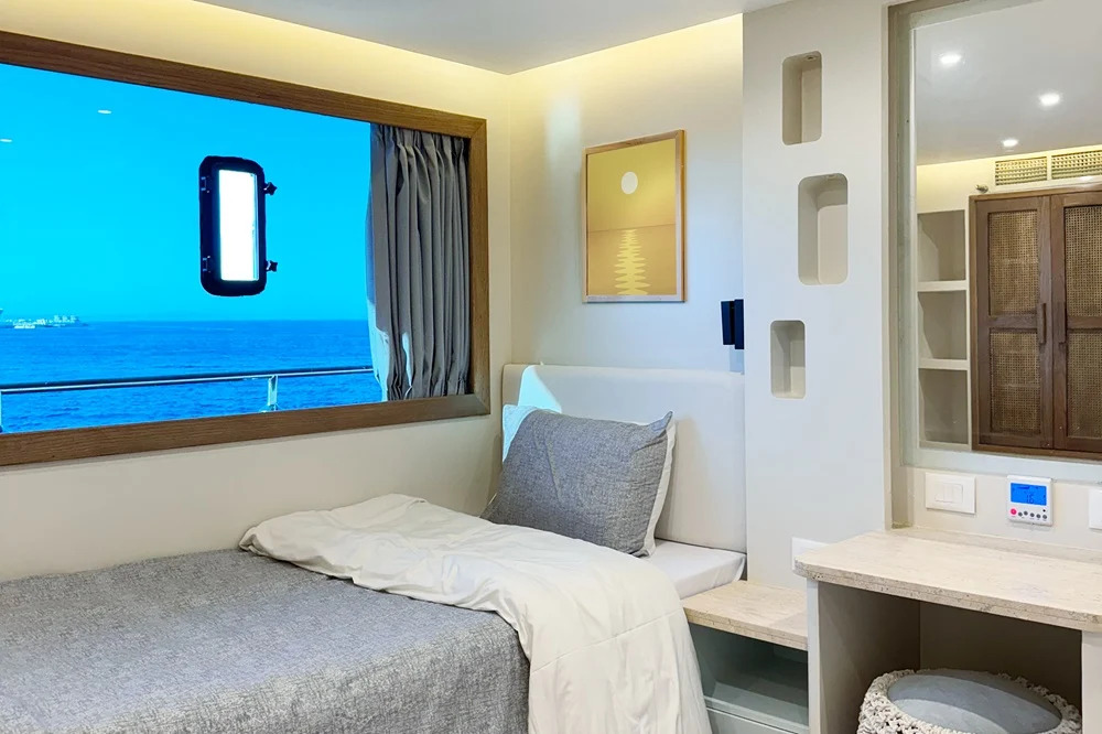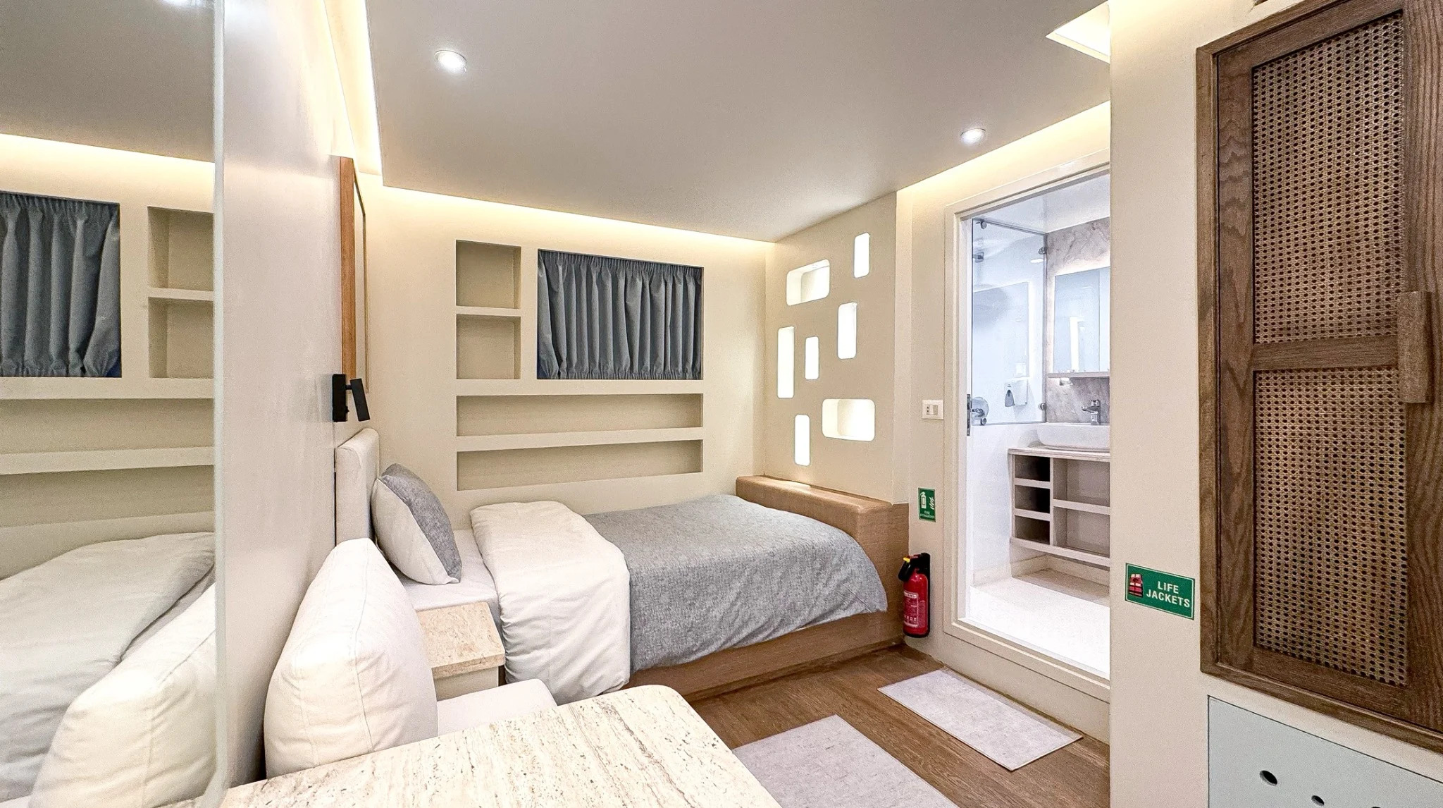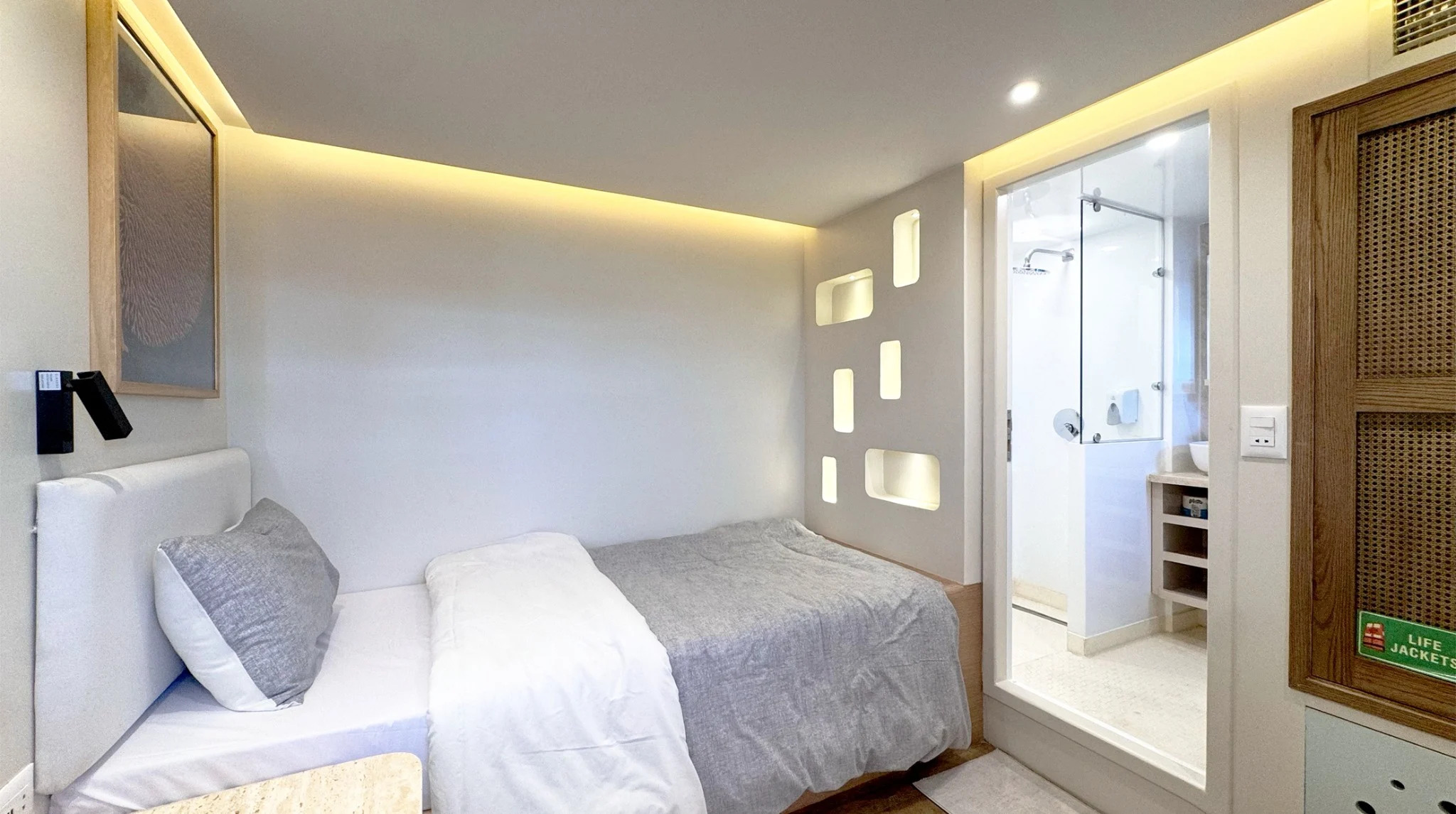 Каюти представлені різними категоріями для індивідуальних мандрівників і пар. На верхній палубі розташована одномісна каюта suite з ванною кімнатою, кондиціонером і видом на море. Тут же доступні каюти з трансформованими ліжками, які можна налаштувати як twin або double, також із ванними кімнатами, халатами та рушниками. Стандартні twin-каюти верхньої палуби мають великі вікна для природного освітлення. На нижній палубі розміщені каюти suite з двоспальними ліжками, окремими ванними кімнатами з гарячим душем і повним набором зручностей, а також п’ять twin-кают із кондиціонуванням, індивідуальними санвузлами та зручним простором для зберігання речей.