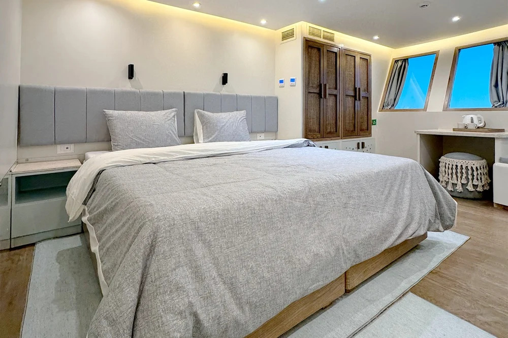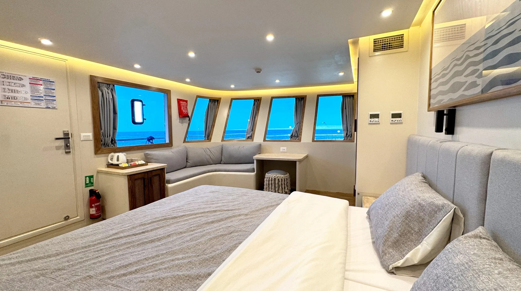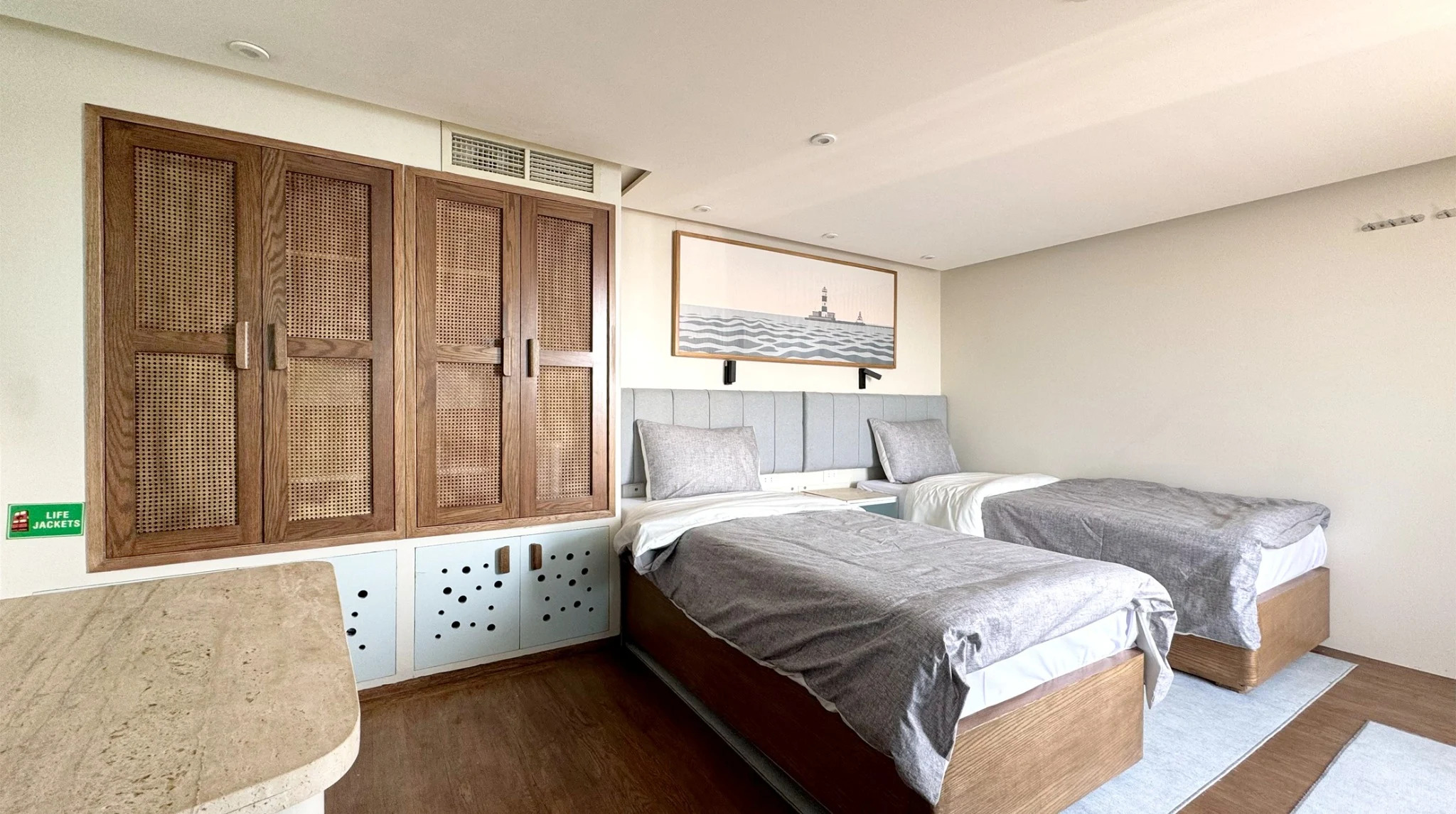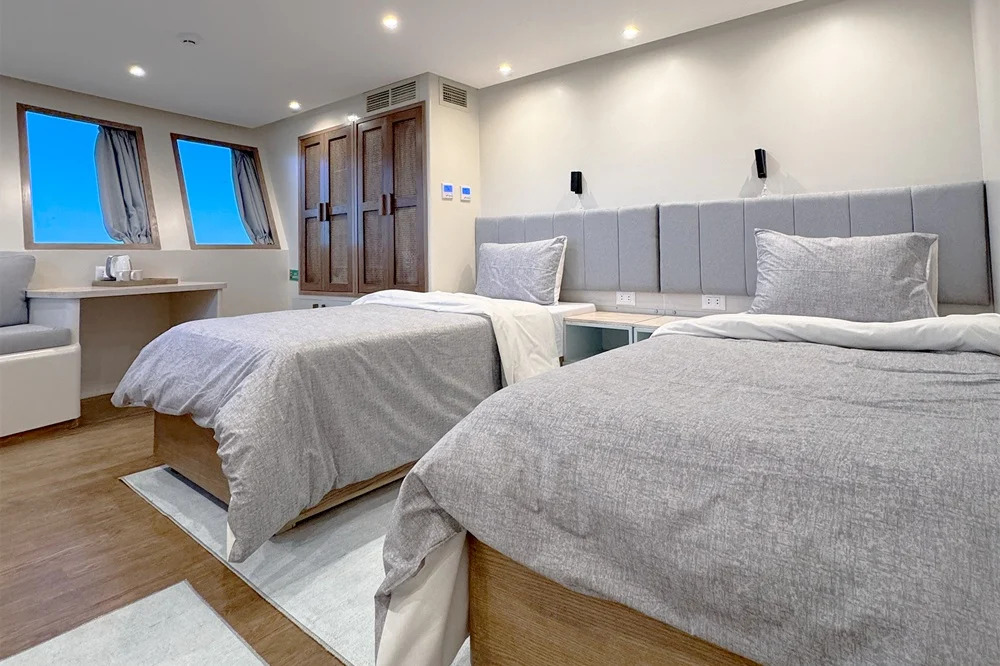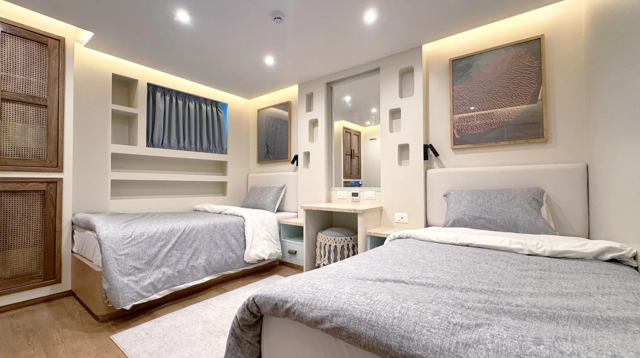 Каюти представлені різними категоріями для індивідуальних мандрівників і пар. На верхній палубі розташована одномісна каюта suite з ванною кімнатою, кондиціонером і видом на море. Тут же доступні каюти з трансформованими ліжками, які можна налаштувати як twin або double, також із ванними кімнатами, халатами та рушниками. Стандартні twin-каюти верхньої палуби мають великі вікна для природного освітлення. На нижній палубі розміщені каюти suite з двоспальними ліжками, окремими ванними кімнатами з гарячим душем і повним набором зручностей, а також п’ять twin-кают із кондиціонуванням, індивідуальними санвузлами та зручним простором для зберігання речей.