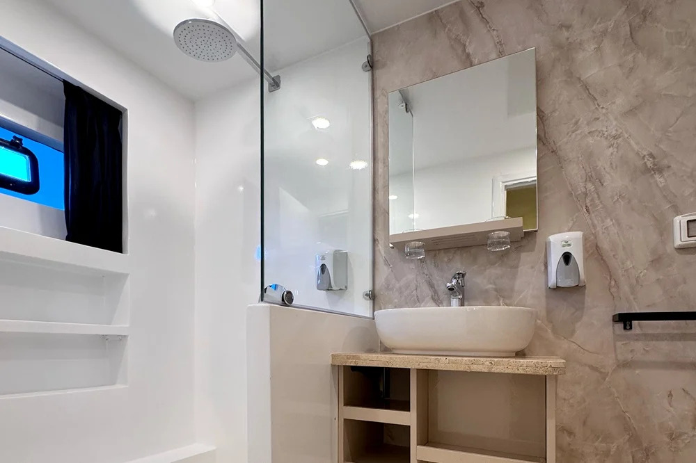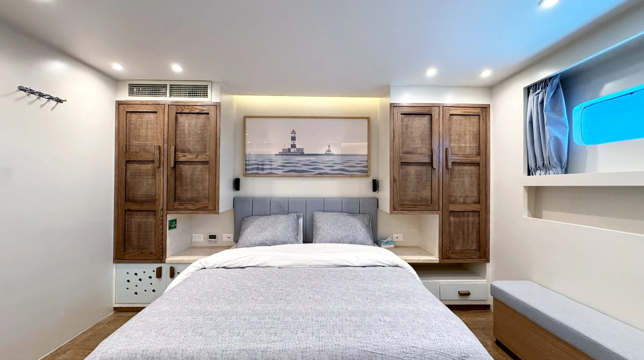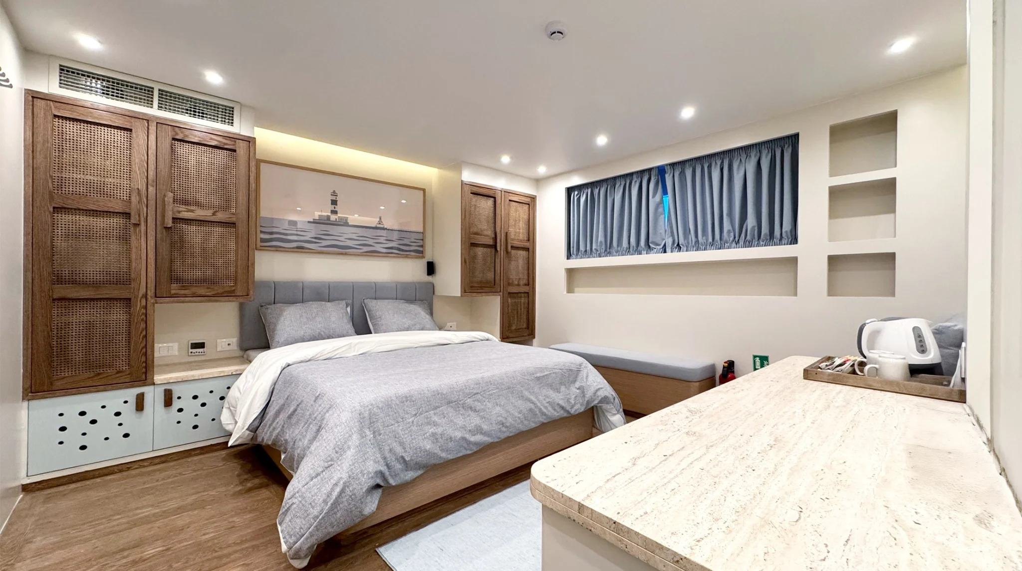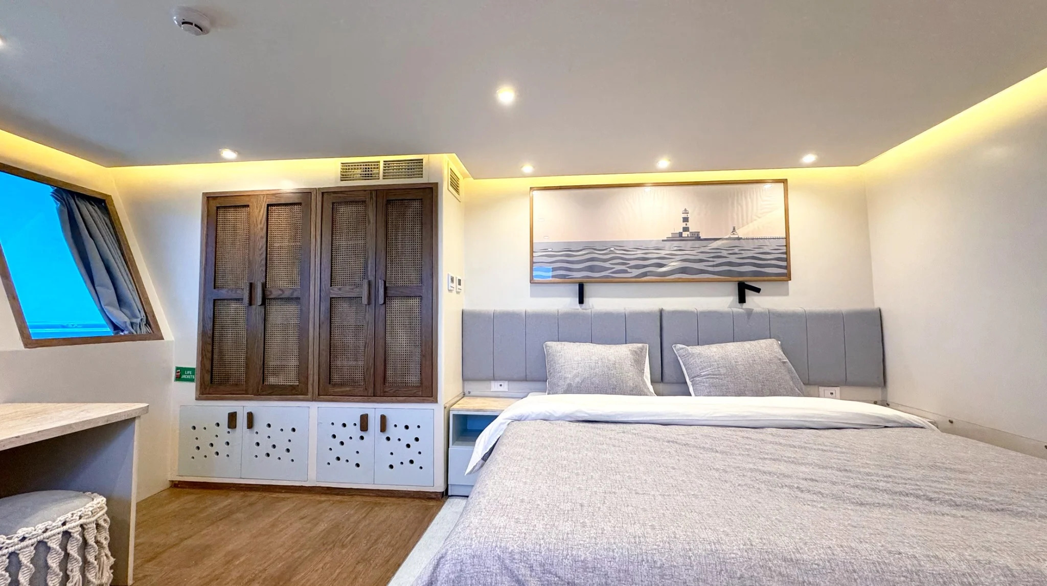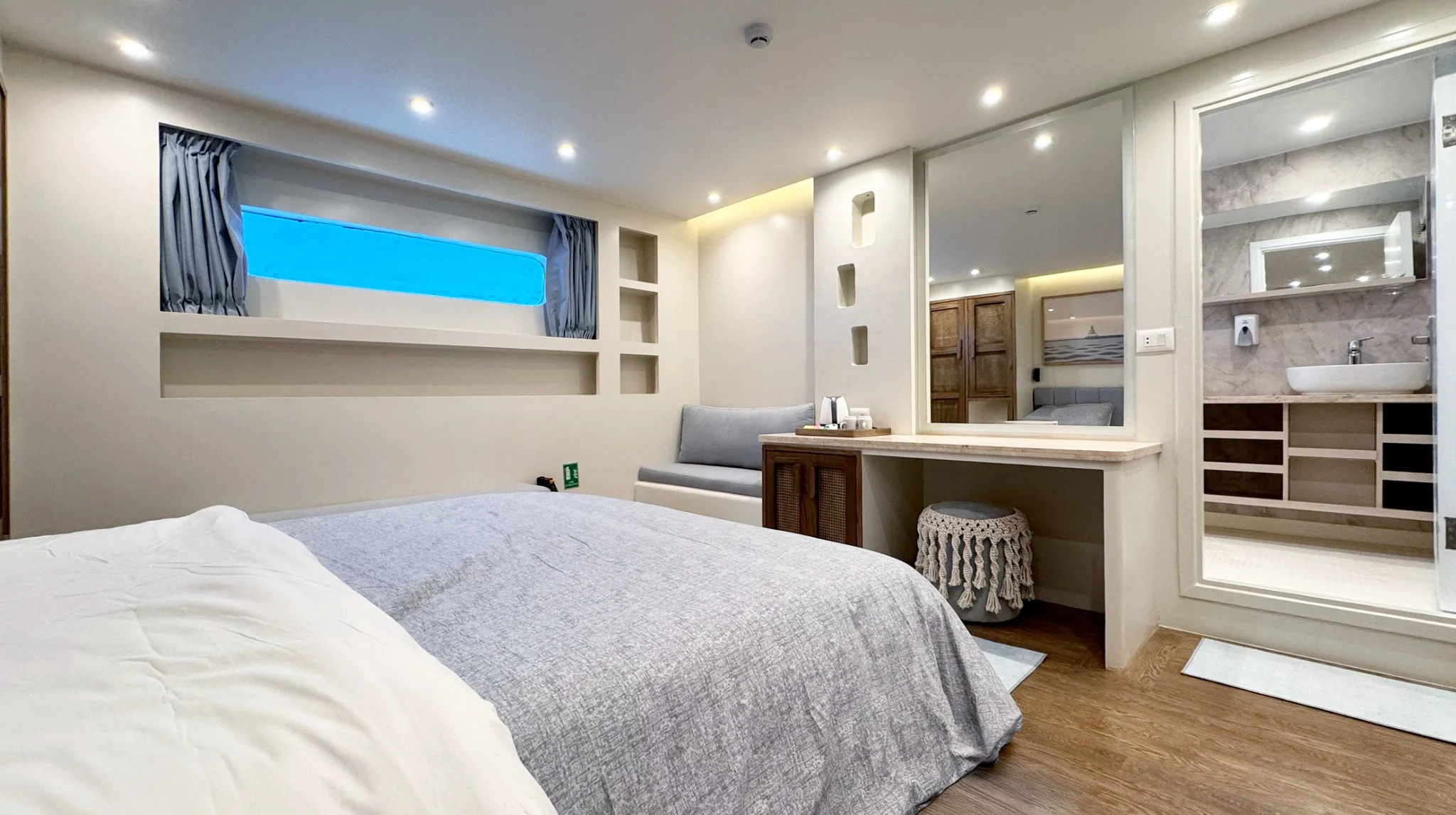 Каюти представлені різними категоріями для індивідуальних мандрівників і пар. На верхній палубі розташована одномісна каюта suite з ванною кімнатою, кондиціонером і видом на море. Тут же доступні каюти з трансформованими ліжками, які можна налаштувати як twin або double, також із ванними кімнатами, халатами та рушниками. Стандартні twin-каюти верхньої палуби мають великі вікна для природного освітлення. На нижній палубі розміщені каюти suite з двоспальними ліжками, окремими ванними кімнатами з гарячим душем і повним набором зручностей, а також п’ять twin-кают із кондиціонуванням, індивідуальними санвузлами та зручним простором для зберігання речей.