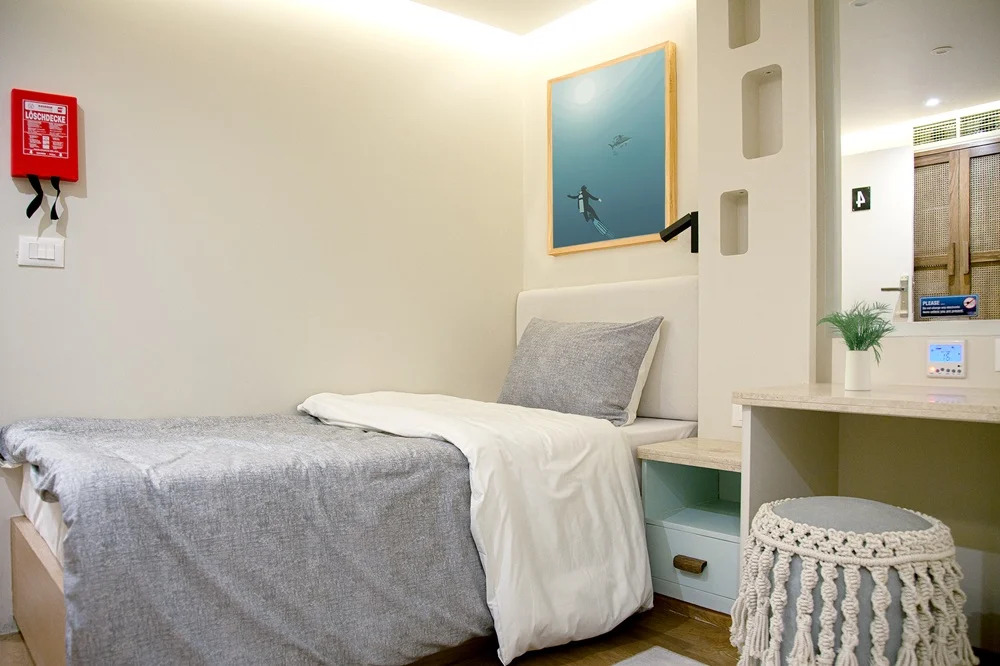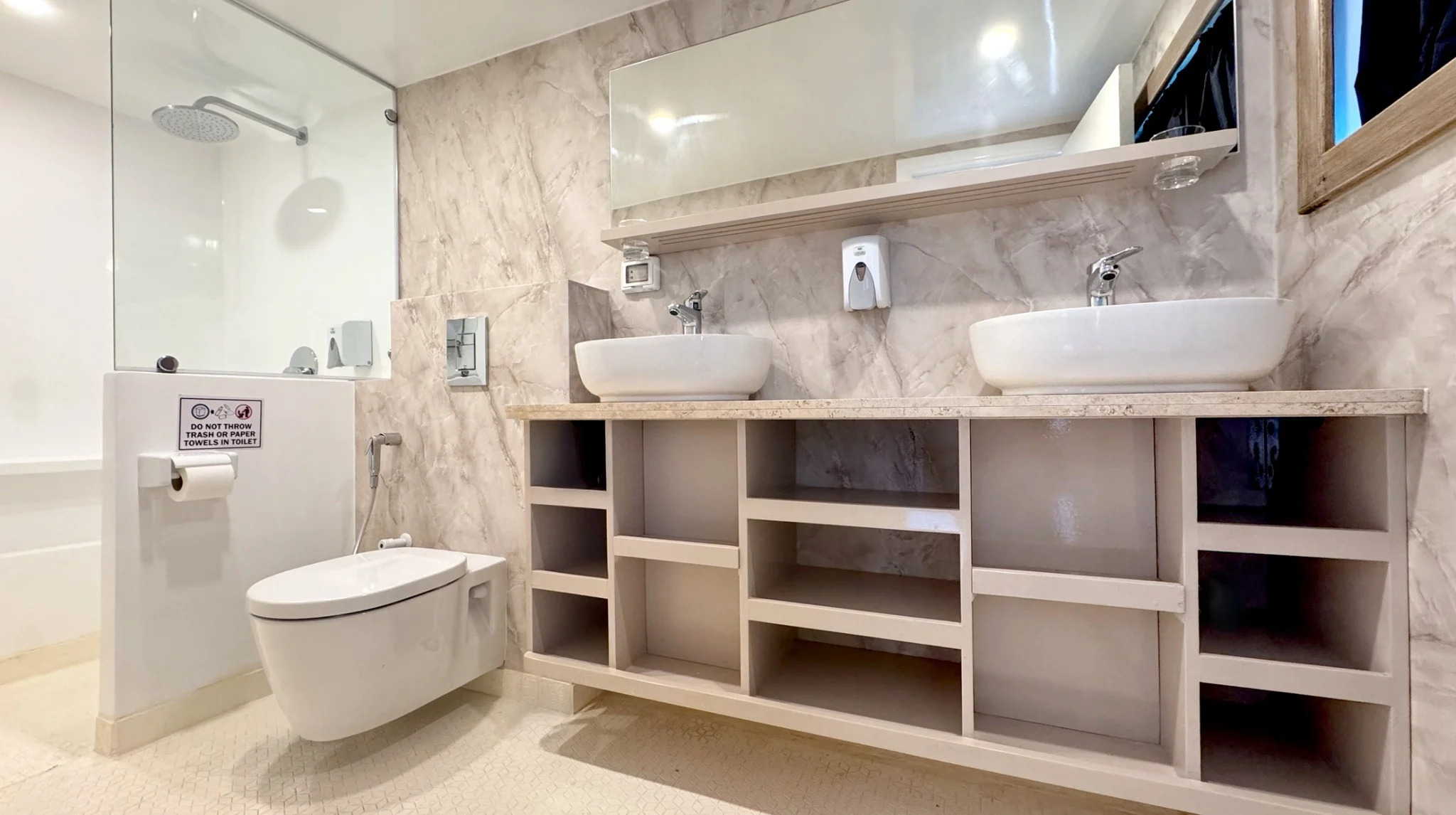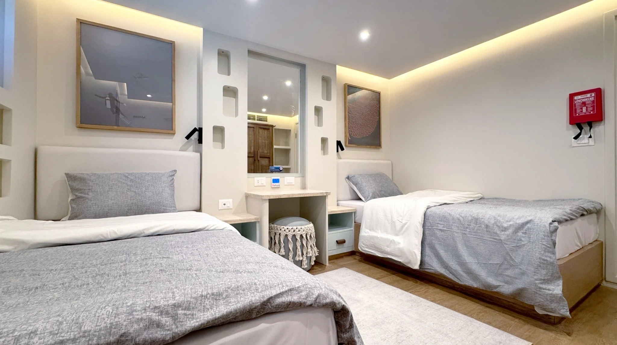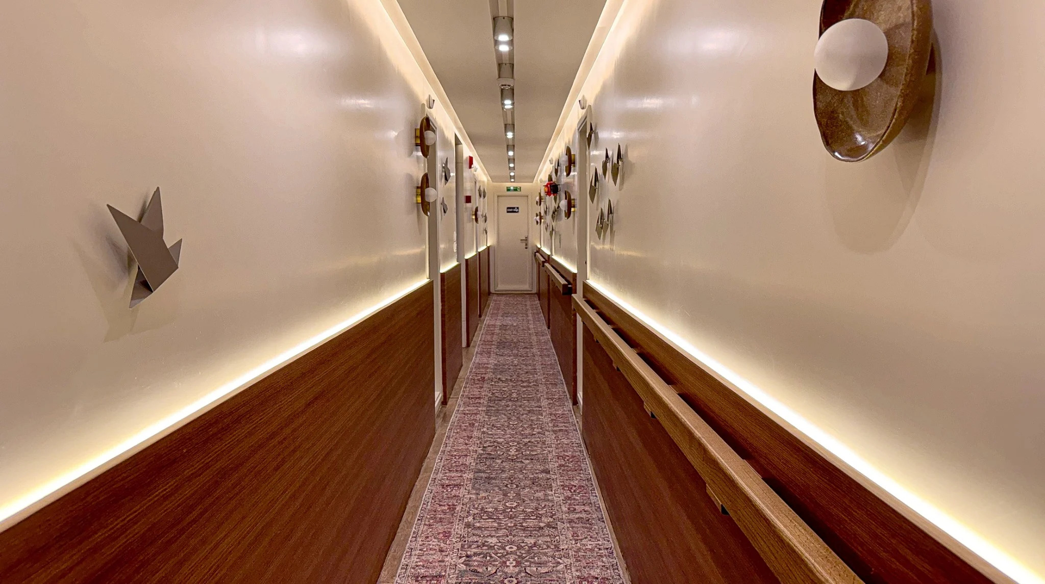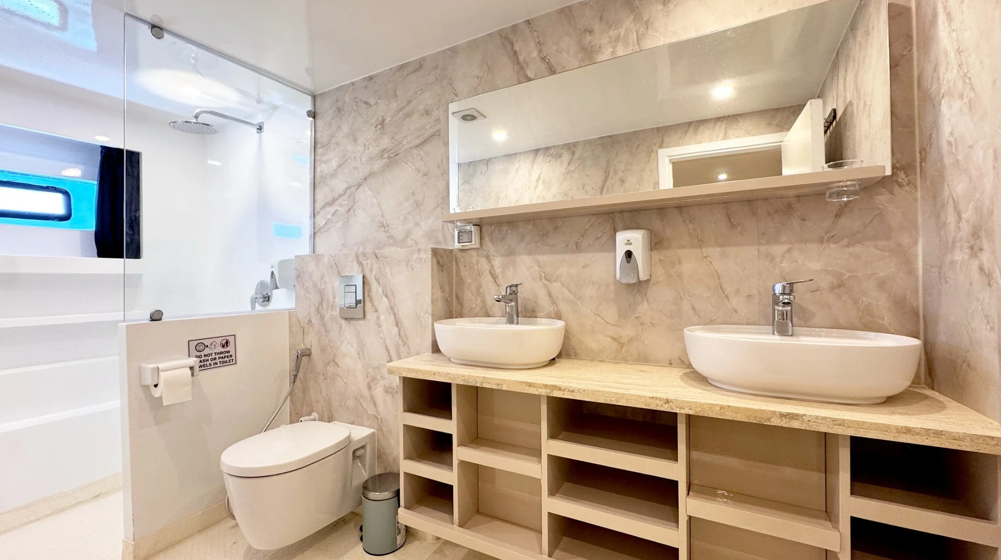 Каюти представлені різними категоріями для індивідуальних мандрівників і пар. На верхній палубі розташована одномісна каюта suite з ванною кімнатою, кондиціонером і видом на море. Тут же доступні каюти з трансформованими ліжками, які можна налаштувати як twin або double, також із ванними кімнатами, халатами та рушниками. Стандартні twin-каюти верхньої палуби мають великі вікна для природного освітлення. На нижній палубі розміщені каюти suite з двоспальними ліжками, окремими ванними кімнатами з гарячим душем і повним набором зручностей, а також п’ять twin-кают із кондиціонуванням, індивідуальними санвузлами та зручним простором для зберігання речей.