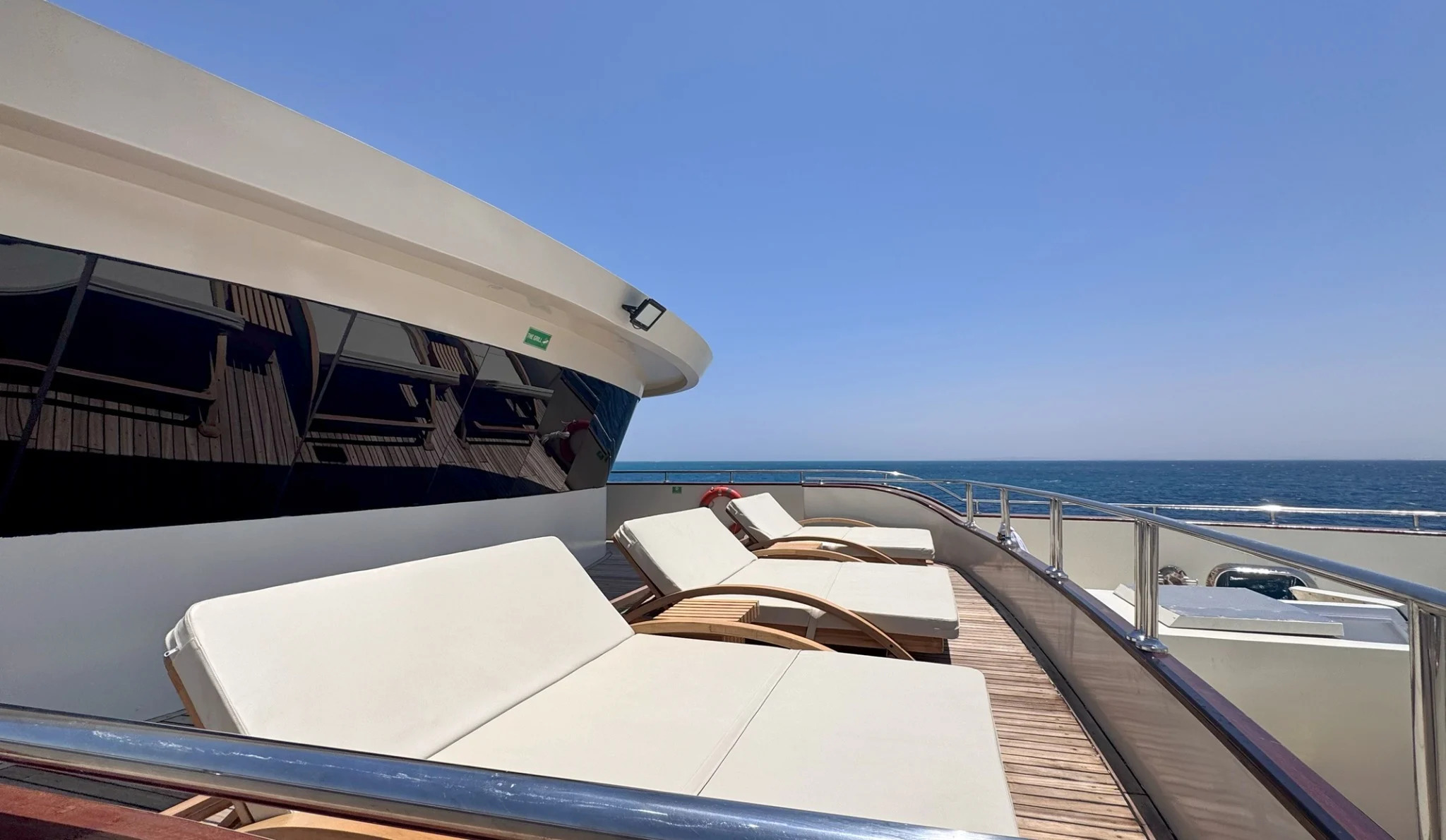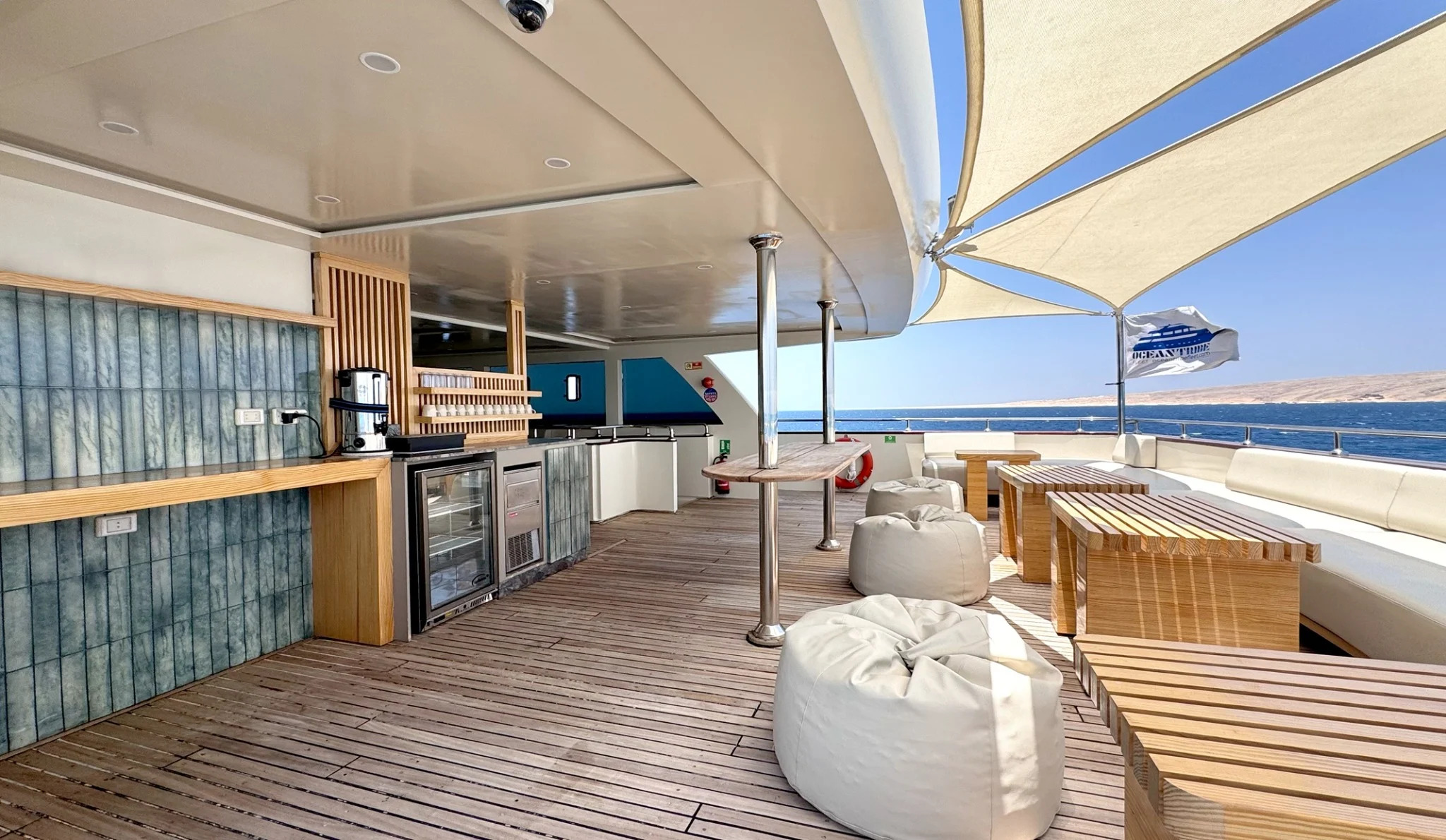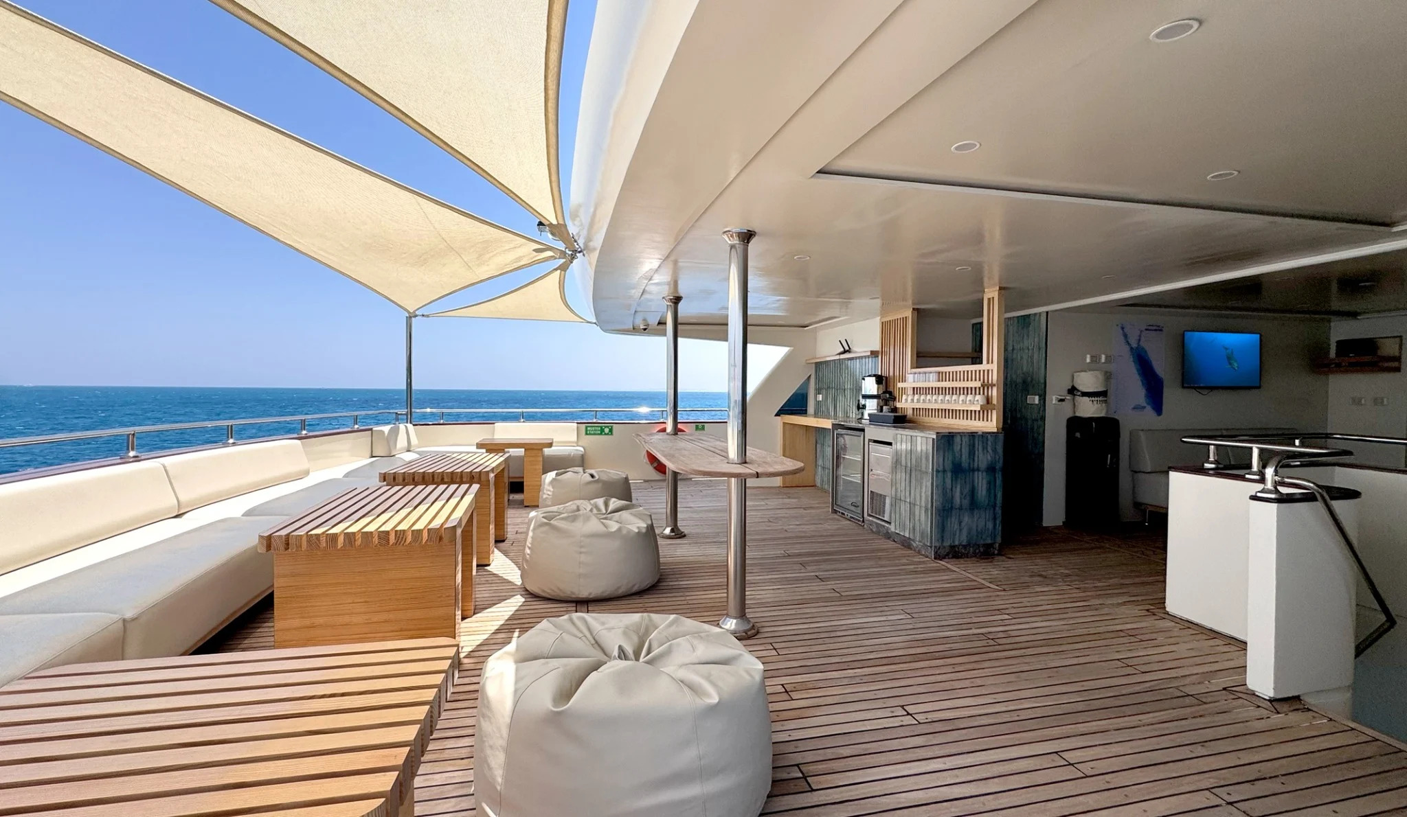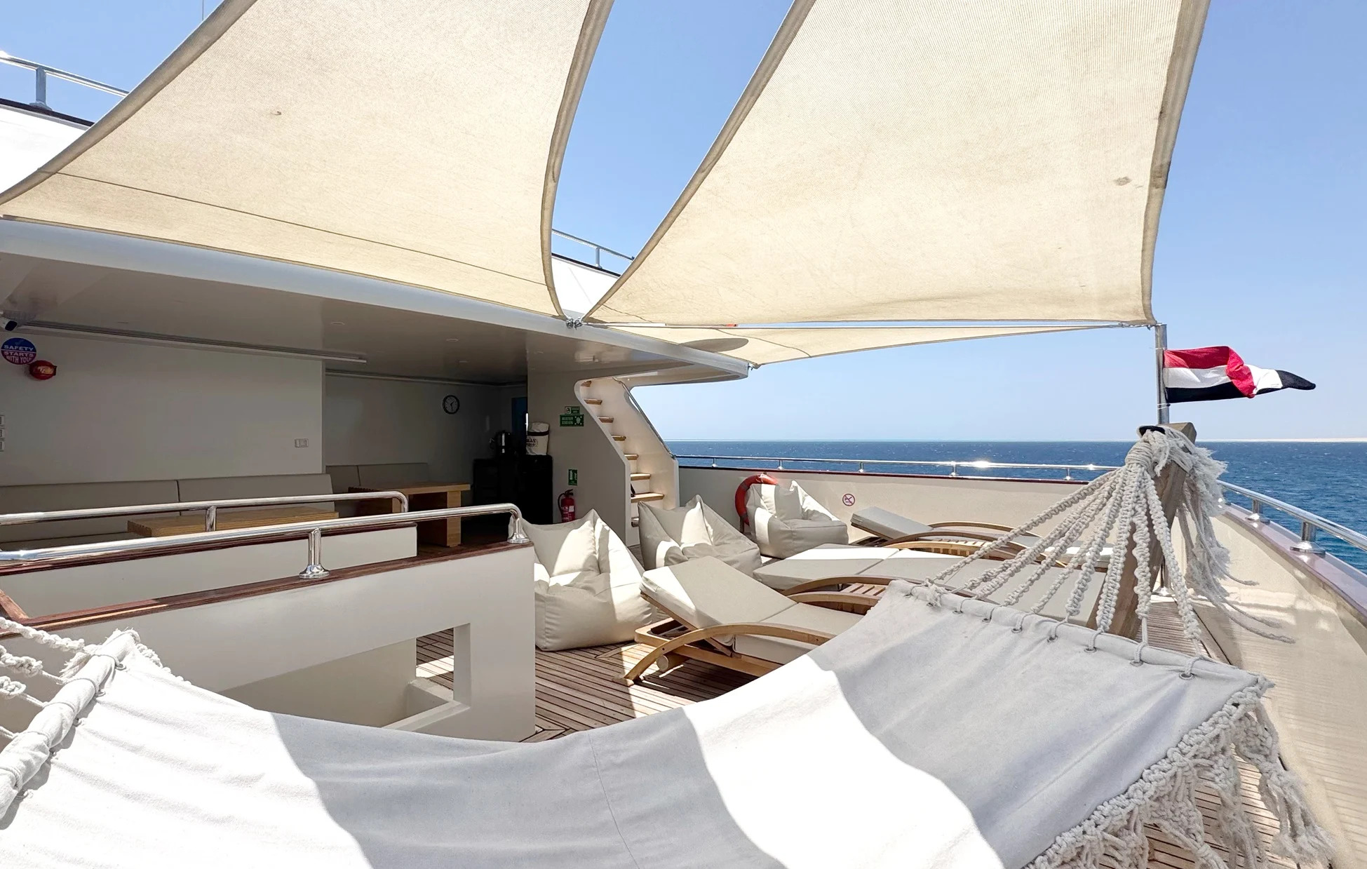 Для відпочинку між зануреннями передбачено чотири окремі відкриті лаунж-зони на верхній і флай-палубах. Це комфортні простори для читання, релаксу або споглядання заходу сонця над Червоним морем. Wi-Fi доступний за наявності покриття. У барі можна придбати місцеві та міжнародні алкогольні напої. На окремих маршрутах, залежно від погодних умов і розкладу, організовуються пляжні BBQ.