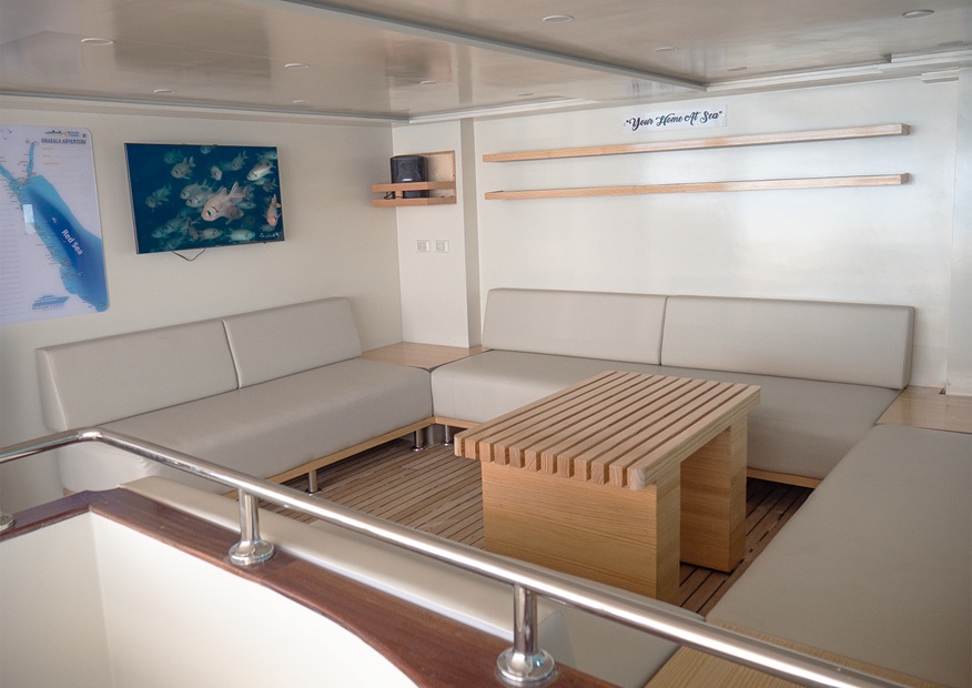 Інтер’єри Ghazala Adventure виконані у сучасному стилі з хорошим природним освітленням. Просторий салон із кондиціонуванням повітря підходить для брифінгів, відпочинку або перегляду фільмів завдяки мультимедійній системі. Поруч розташована обідня зона, де тричі на день подають харчування у форматі «шведський стіл». На верхній і флай-палубах облаштовано кілька відкритих лаунж-зон із лежаками, пуфами та столиками в тіні. Тут же доступні станції з чаєм і кавою - зручно зробити перерву між зануреннями з чашкою капучино або трав’яного чаю.