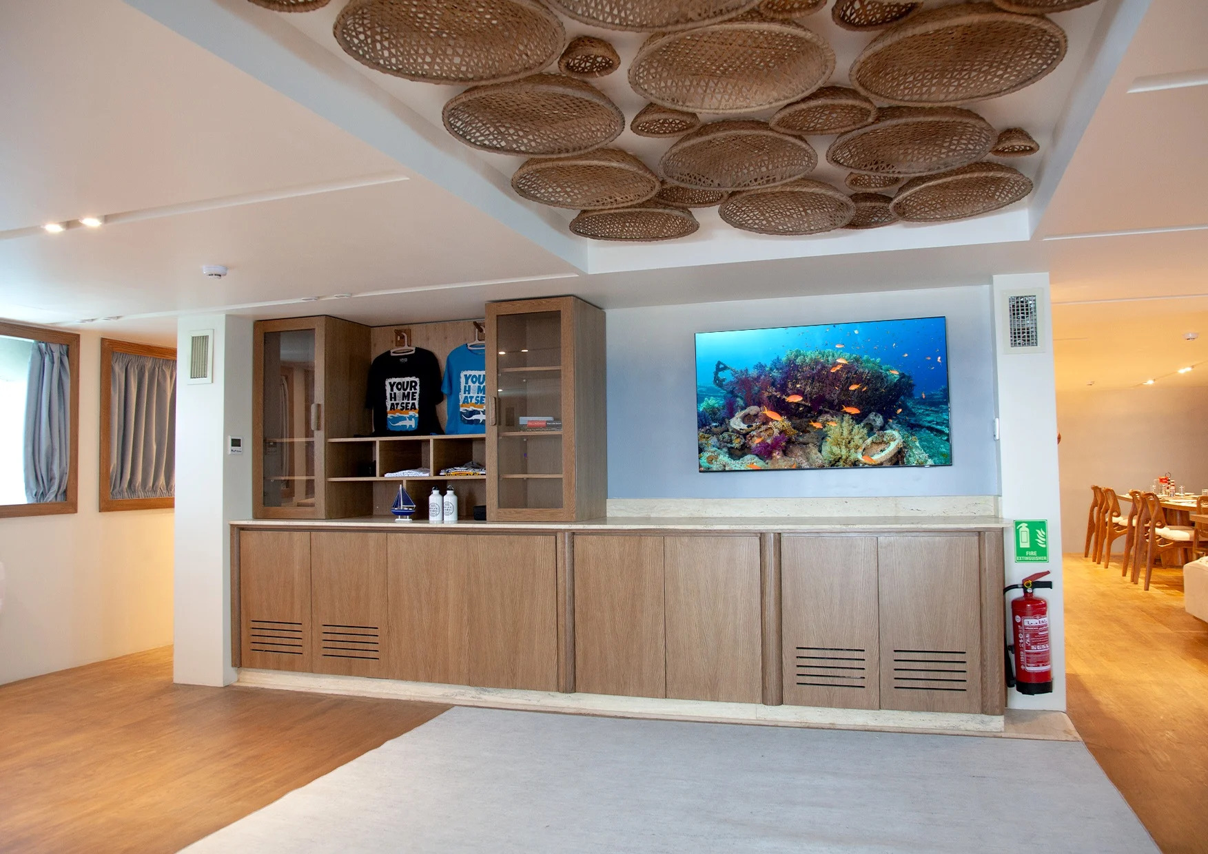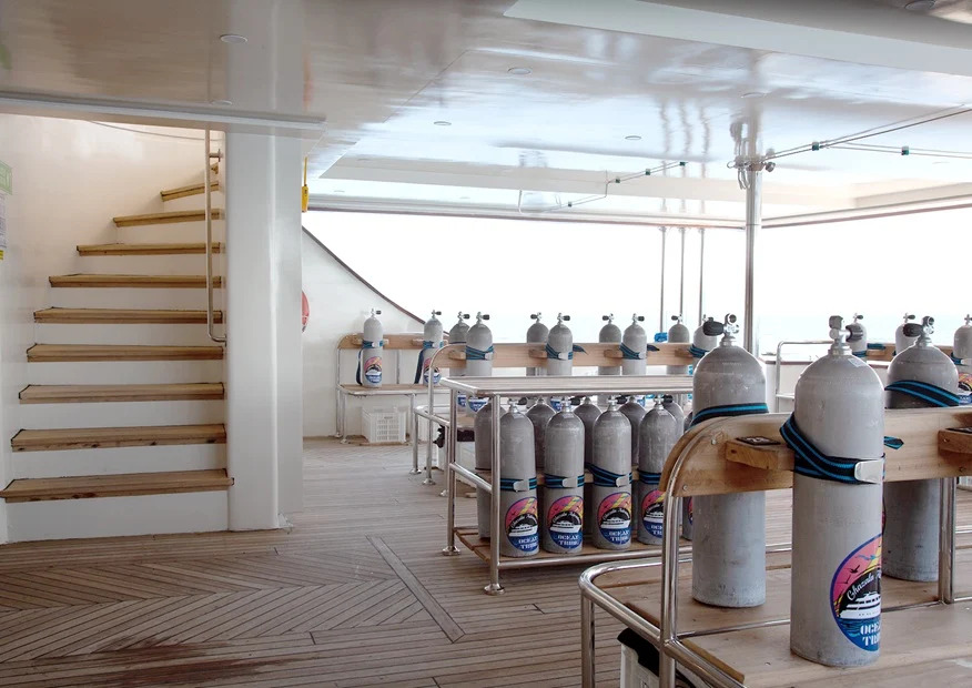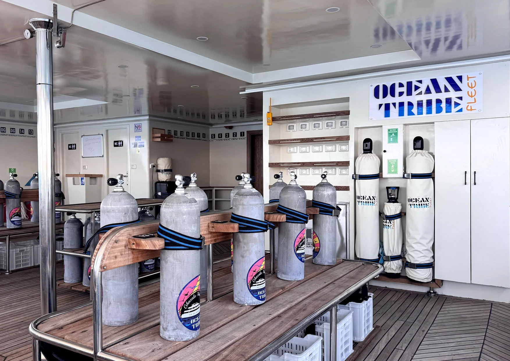 Дайв-палуба безпосередньо з’єднана із салоном і продумана до дрібниць. Вона простора, частково затінена та обладнана окремою зоною для підводних фотографів зі столами для камер, зарядними станціями та баками для ополіскування делікатної техніки. Для виходу на дайв-сайти використовуються два швидкісні зодіаки. Після занурень можна скористатися прісними душами на платформі. Зазвичай на борту працюють два–три дайв-гіди. Сертифікованим дайверам Nitrox надається безкоштовно.