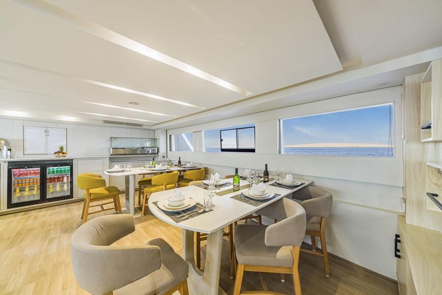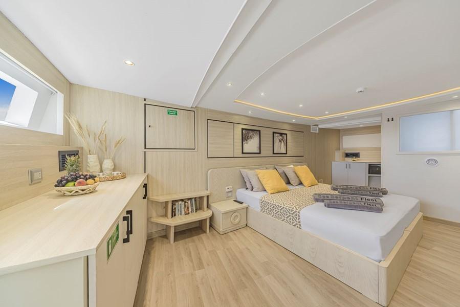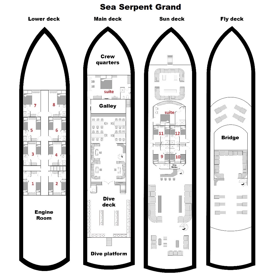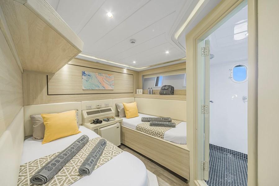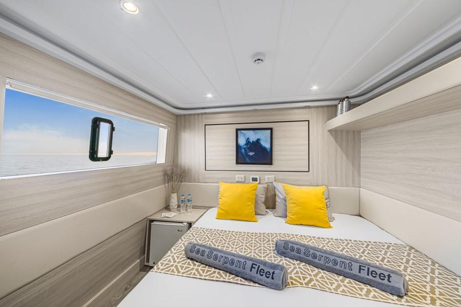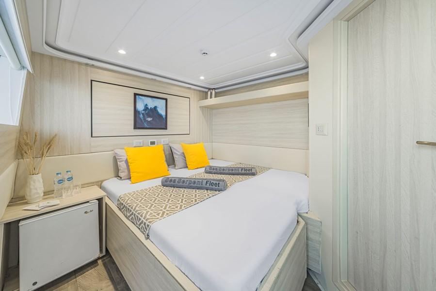 На яхті Sea Serpent Grand 14 двомісних кают. На нижній палубі розташовані 6 кают з двома односпальними ліжками та 2 каюти з двоспальними ліжками. На сан-деку - 4 каюти з двома односпальними ліжками та 1 каюта Suite з двоспальним ліжком. Ще одна каюта Suite, обладнана двоспальним ліжком, знаходиться на головній палубі. У кожній каюті є ванна кімната (туалет, душ - холодна та гаряча вода), кондиціонер, аудіосистема.
