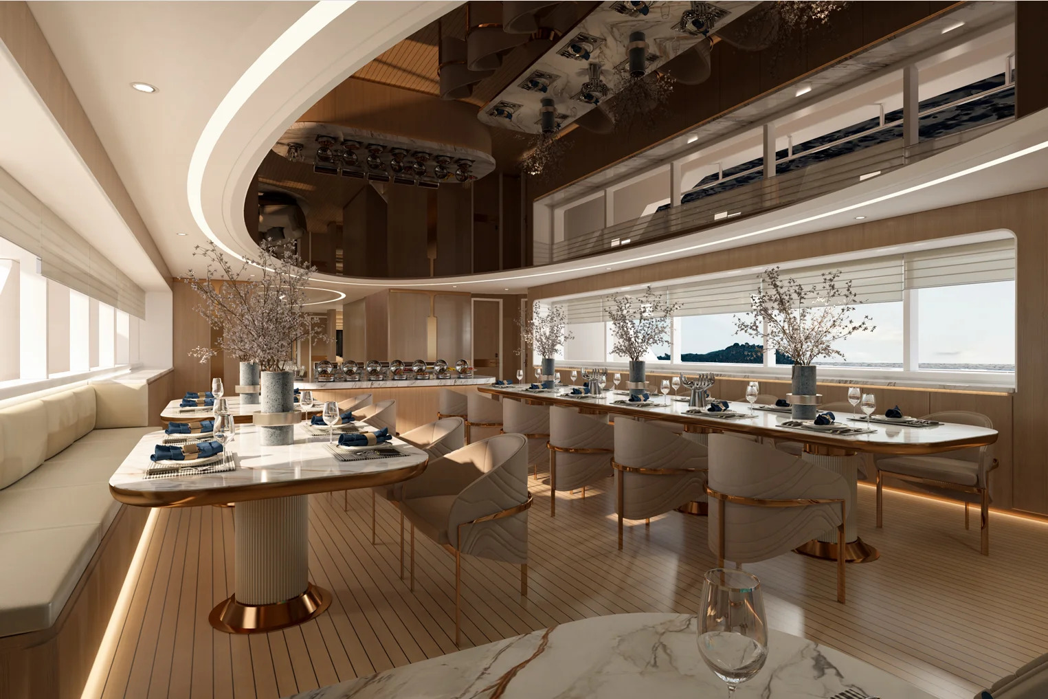 Яхта вирізняється просторими зонами відпочинку: на борту є басейн, лаунж із широкими оглядовими вікнами, кімната для фототехніки, spa-кабінет, невеликий фітнес-куток, бар із фрешами та велика сонячна палуба. Гостям надається безкоштовний WiFi.