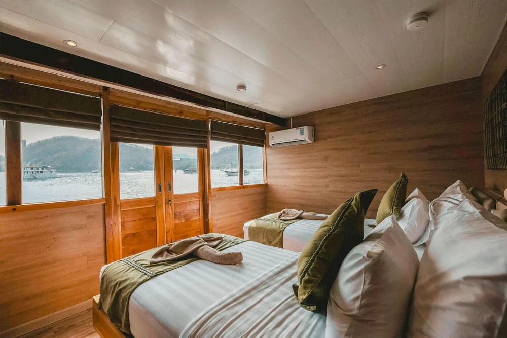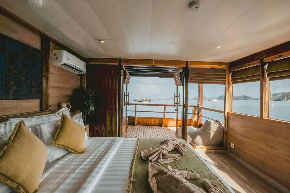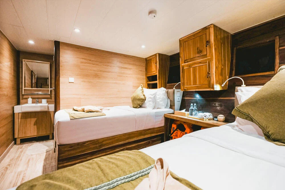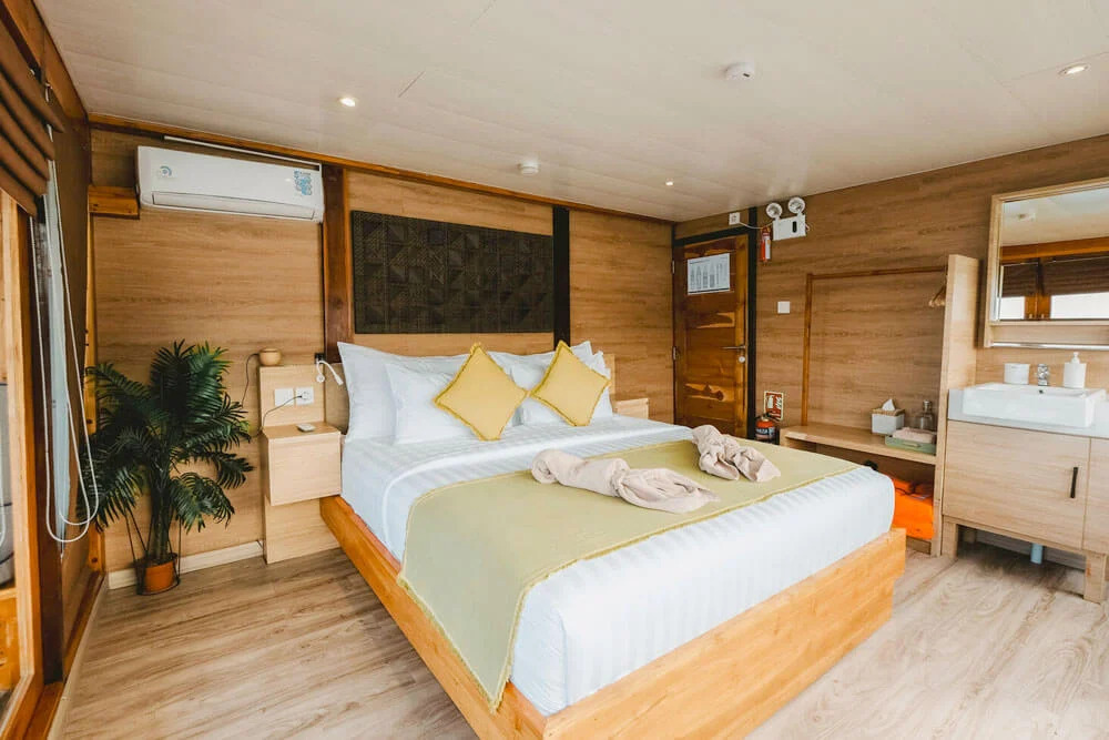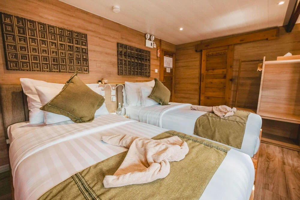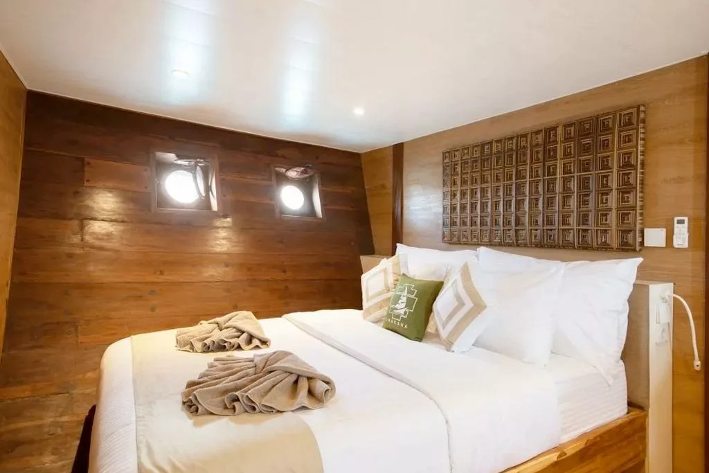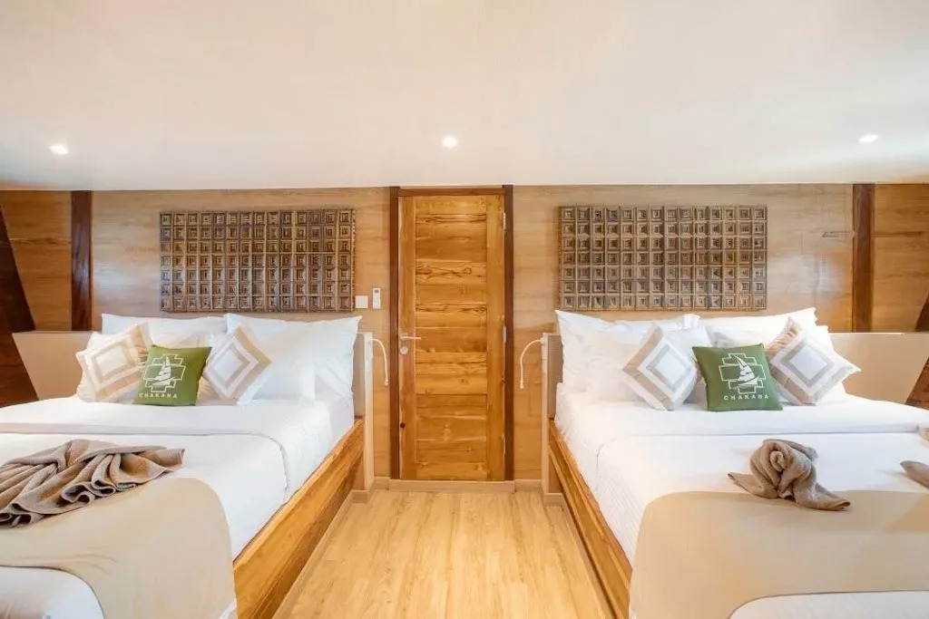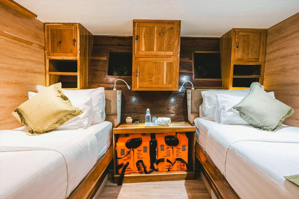 На нижній палубі розташовані 4 каюти з односпальними та окремими ліжками та простора каюта Suite. Верхня палуба пропонує дві каюти Premium Twin Suites із панорамним видом на океан і дві каюти Superior Double Suites із приватними балконами - ідеальне місце для споглядання заходів сонця. Усі каюти обладнані кондиціонуванням, ванною кімнатою з гарячою водою та місткими шафками для речей.