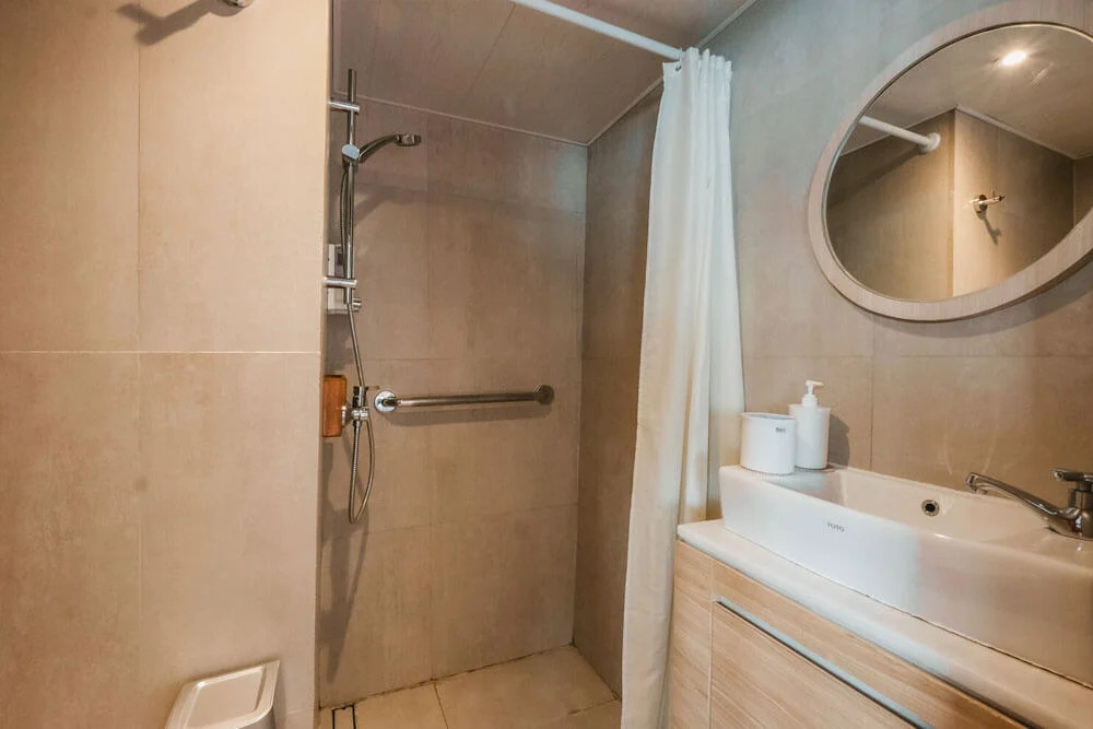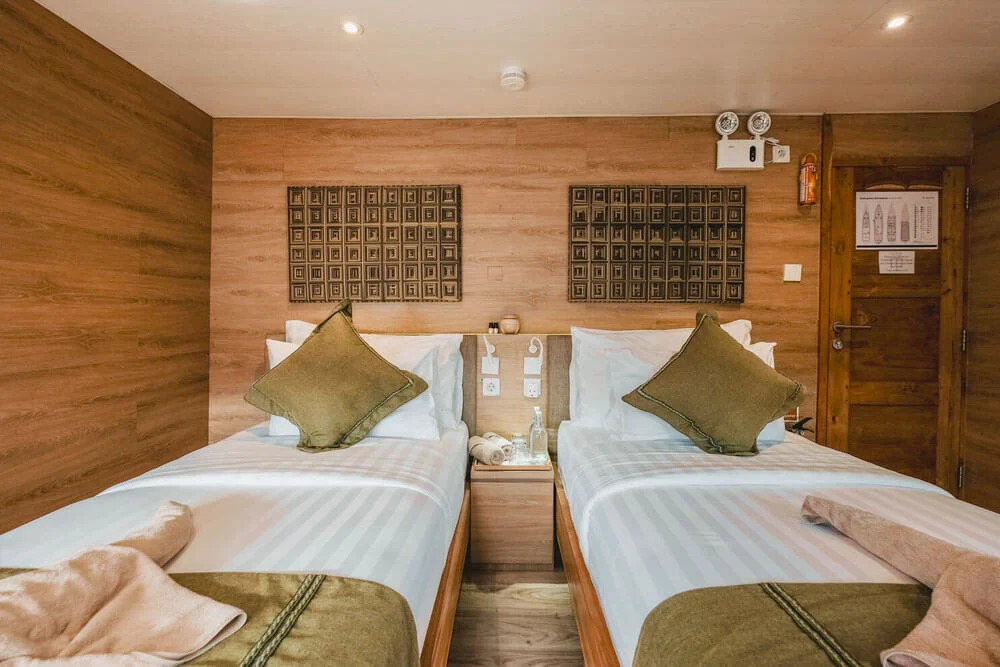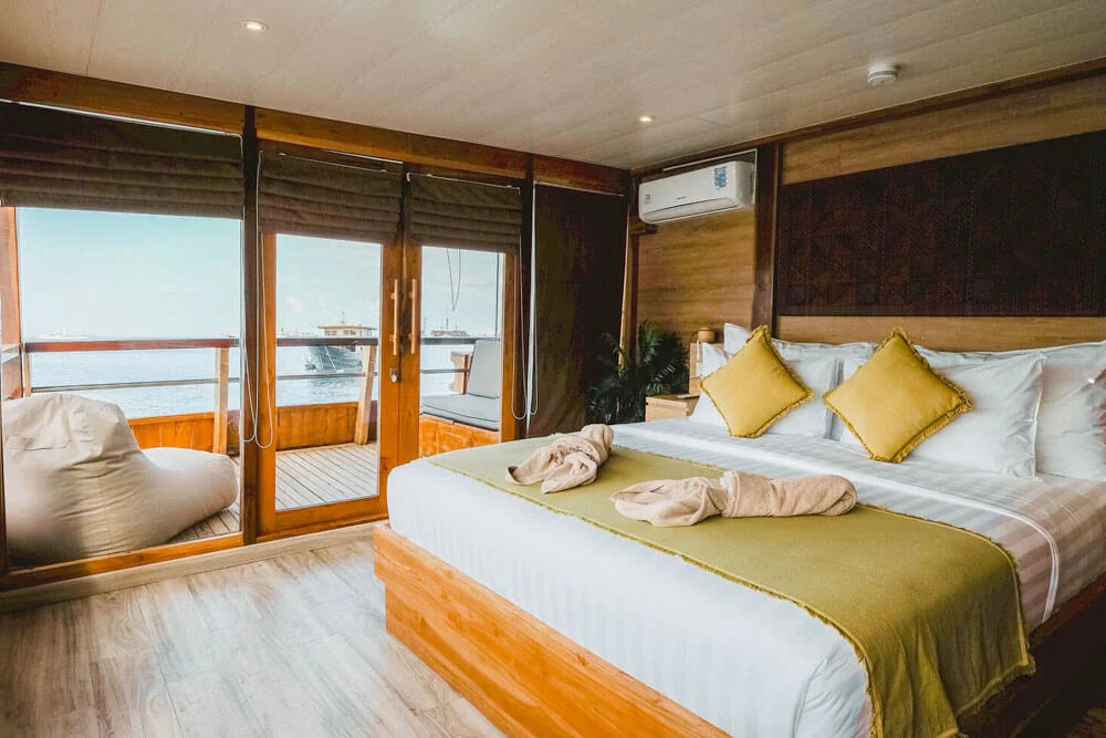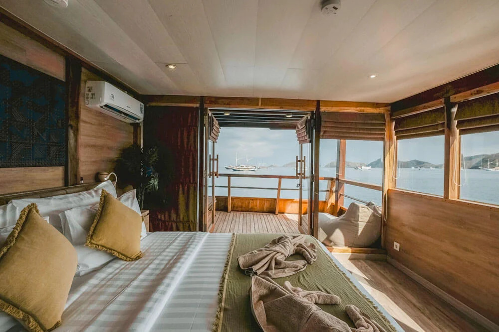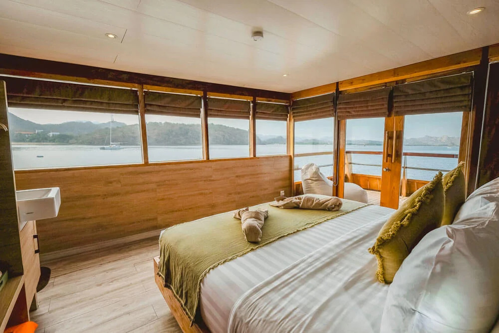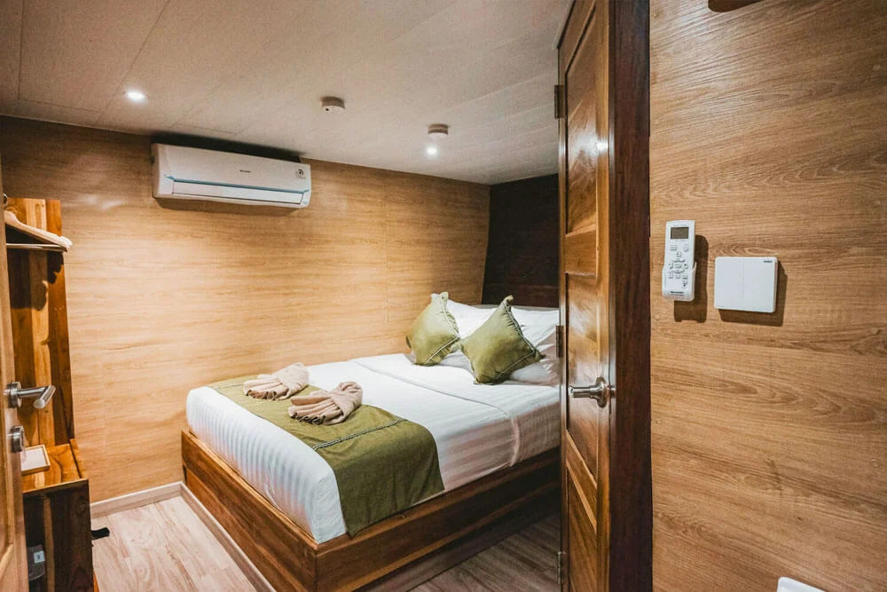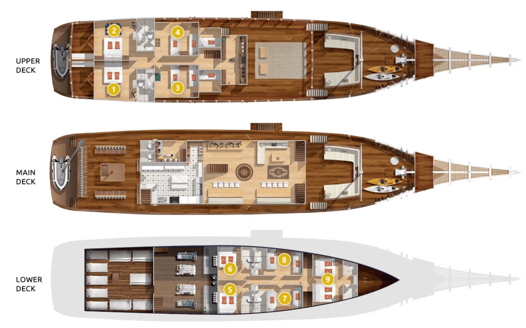 На нижній палубі розташовані 4 каюти з односпальними та окремими ліжками та простора каюта Suite. Верхня палуба пропонує дві каюти Premium Twin Suites із панорамним видом на океан і дві каюти Superior Double Suites із приватними балконами - ідеальне місце для споглядання заходів сонця. Усі каюти обладнані кондиціонуванням, ванною кімнатою з гарячою водою та місткими шафками для речей.