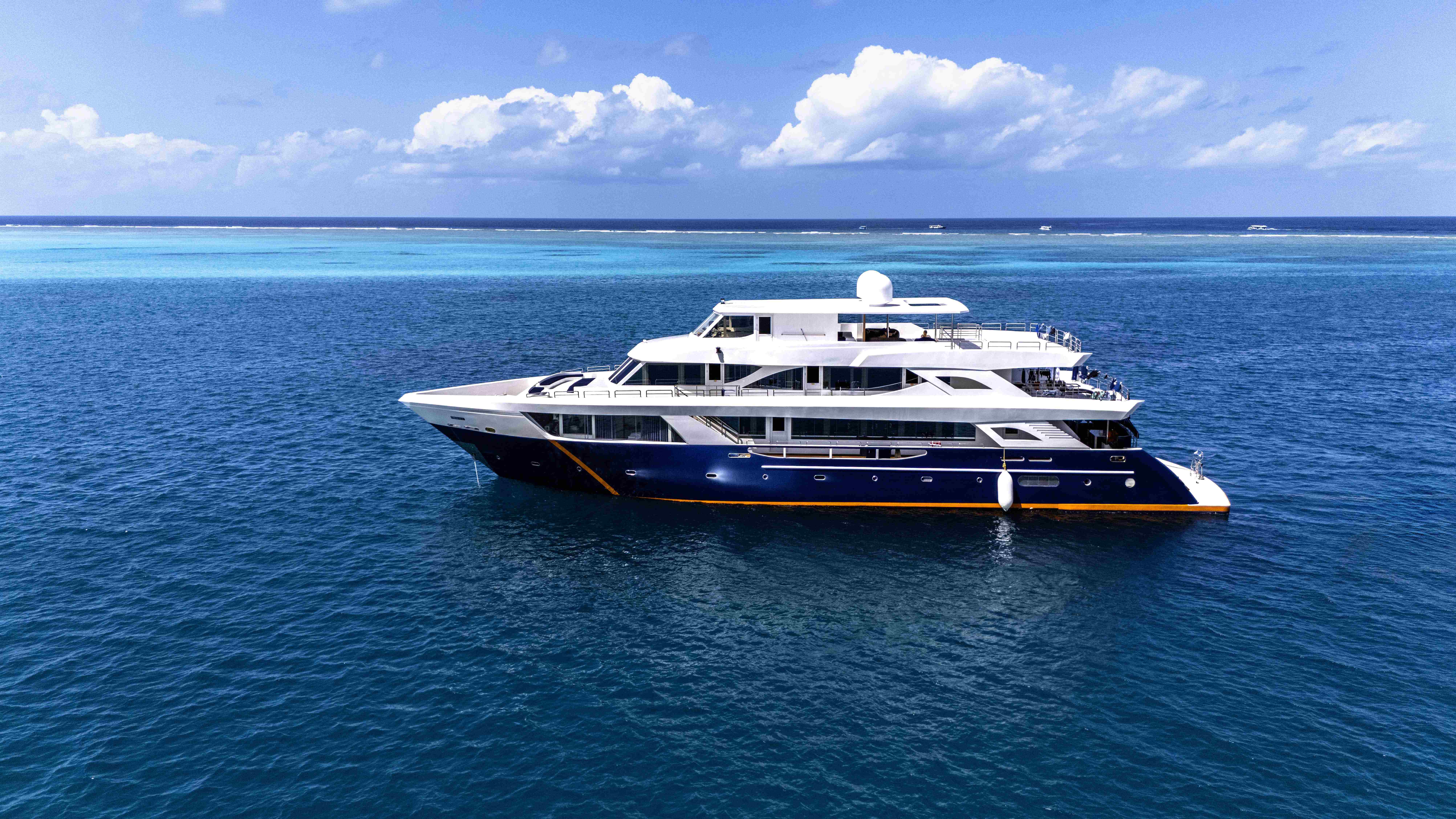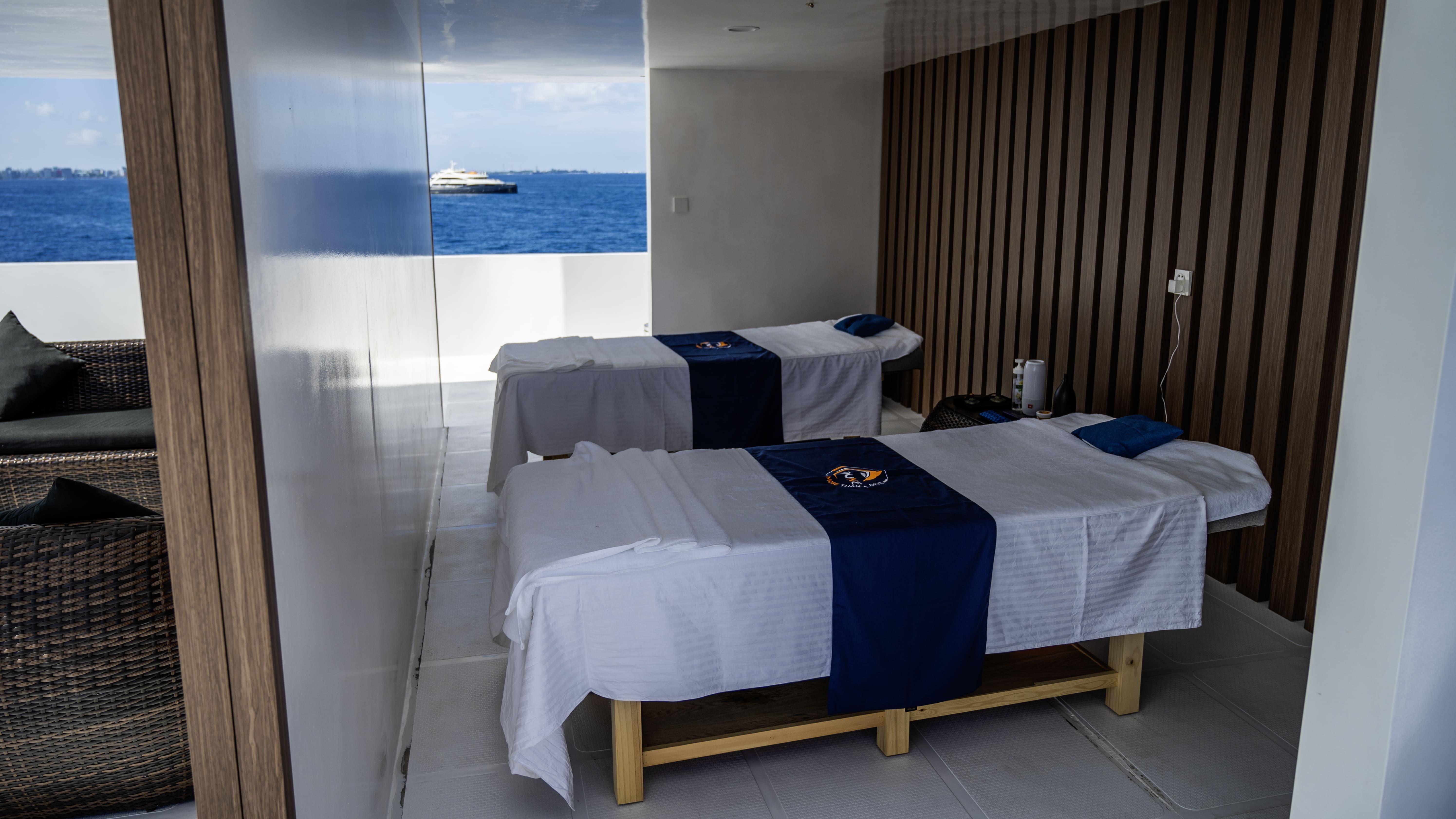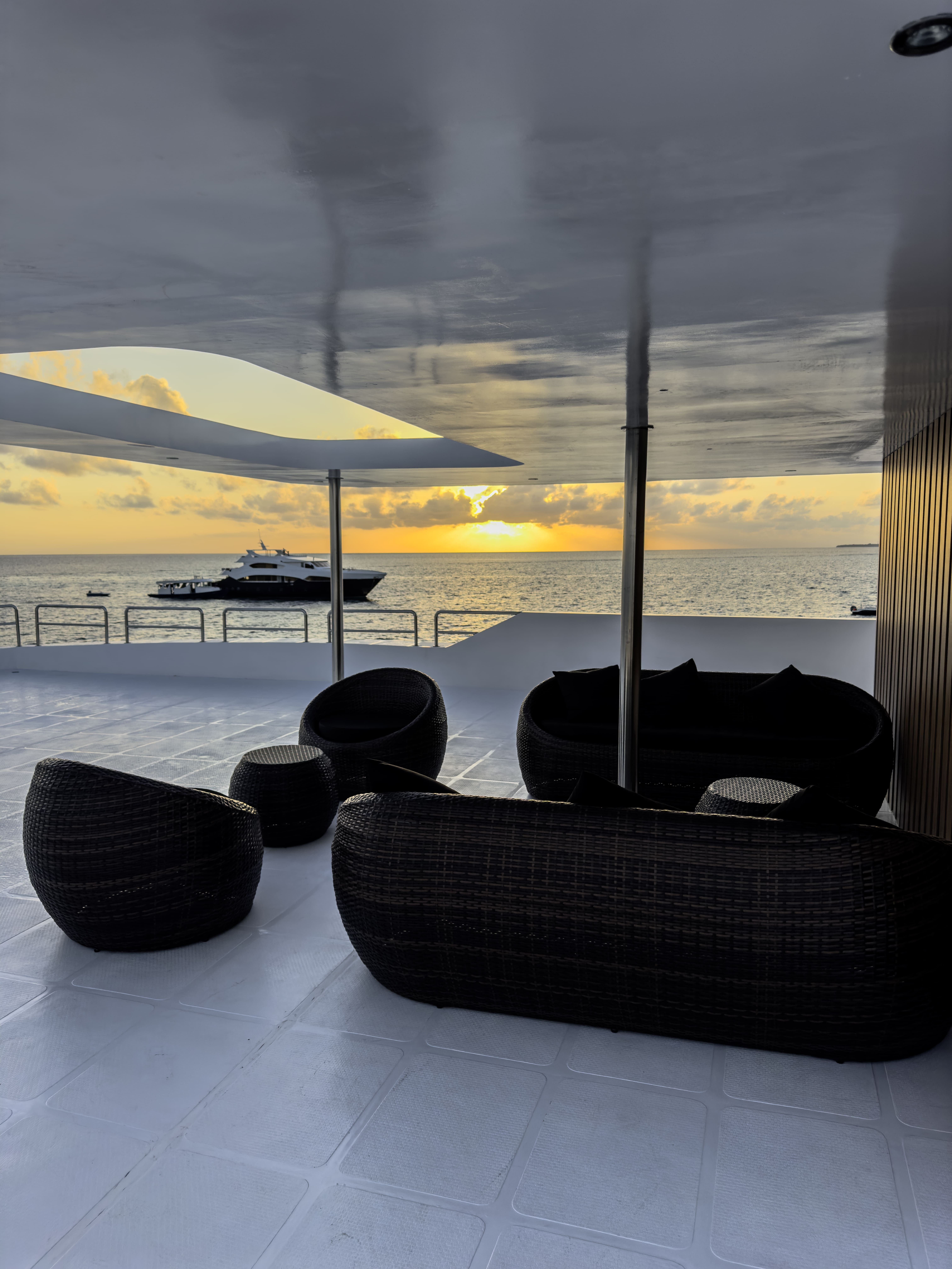 Гості можуть насолоджуватися трапезами на відкритому повітрі, милуючись океанськими краєвидами, або відпочити на сан-деку з масажем під лагідним мальдівським сонцем. Усередині яхти облаштовано затишний коктейль-лаунж для спілкування та зал для розваг, де можна подивитися фільм або пограти у настільні ігри. Сан дек запрошує поніжитися у теплих променях сонця та відчути справжню свободу.