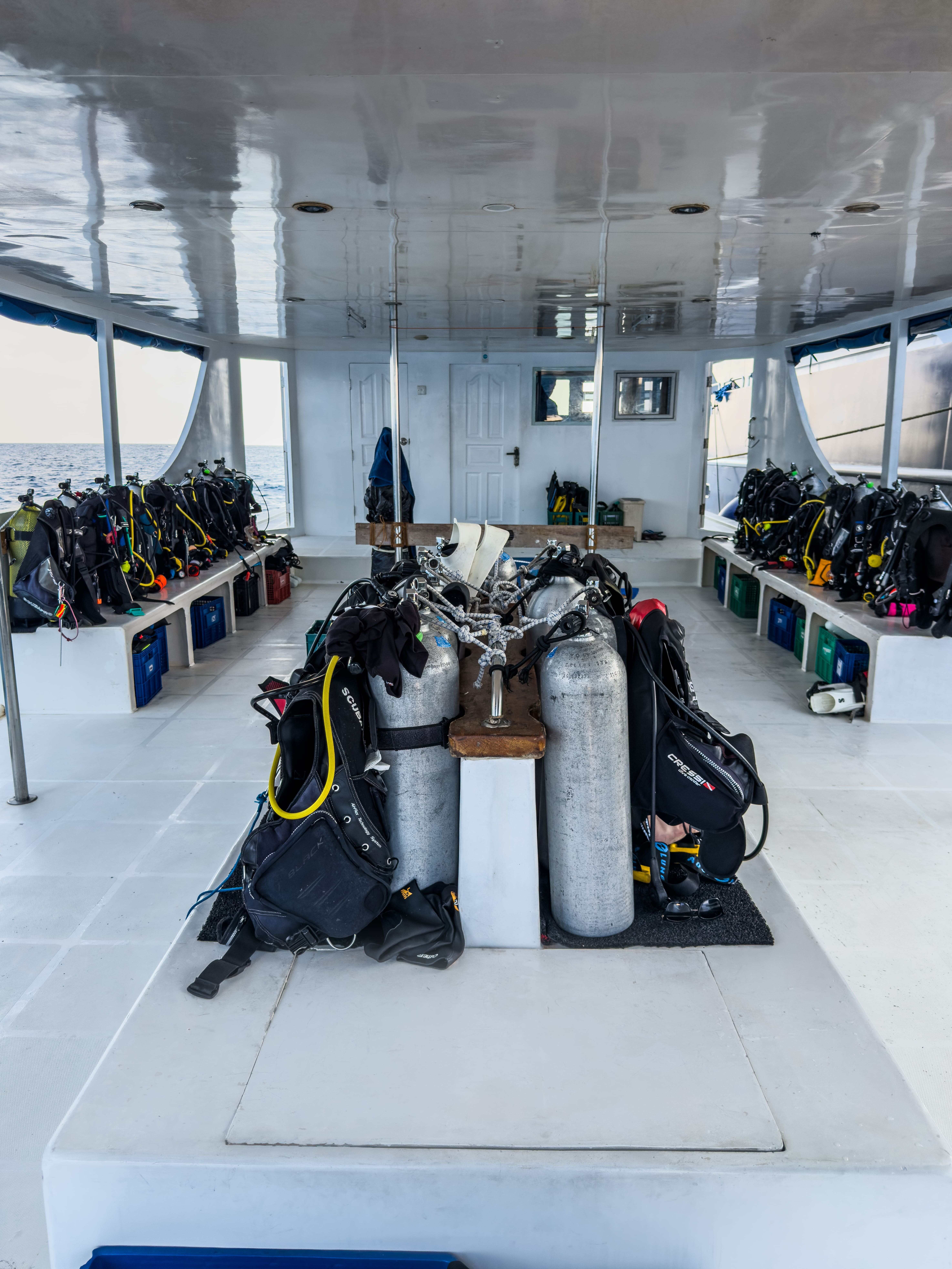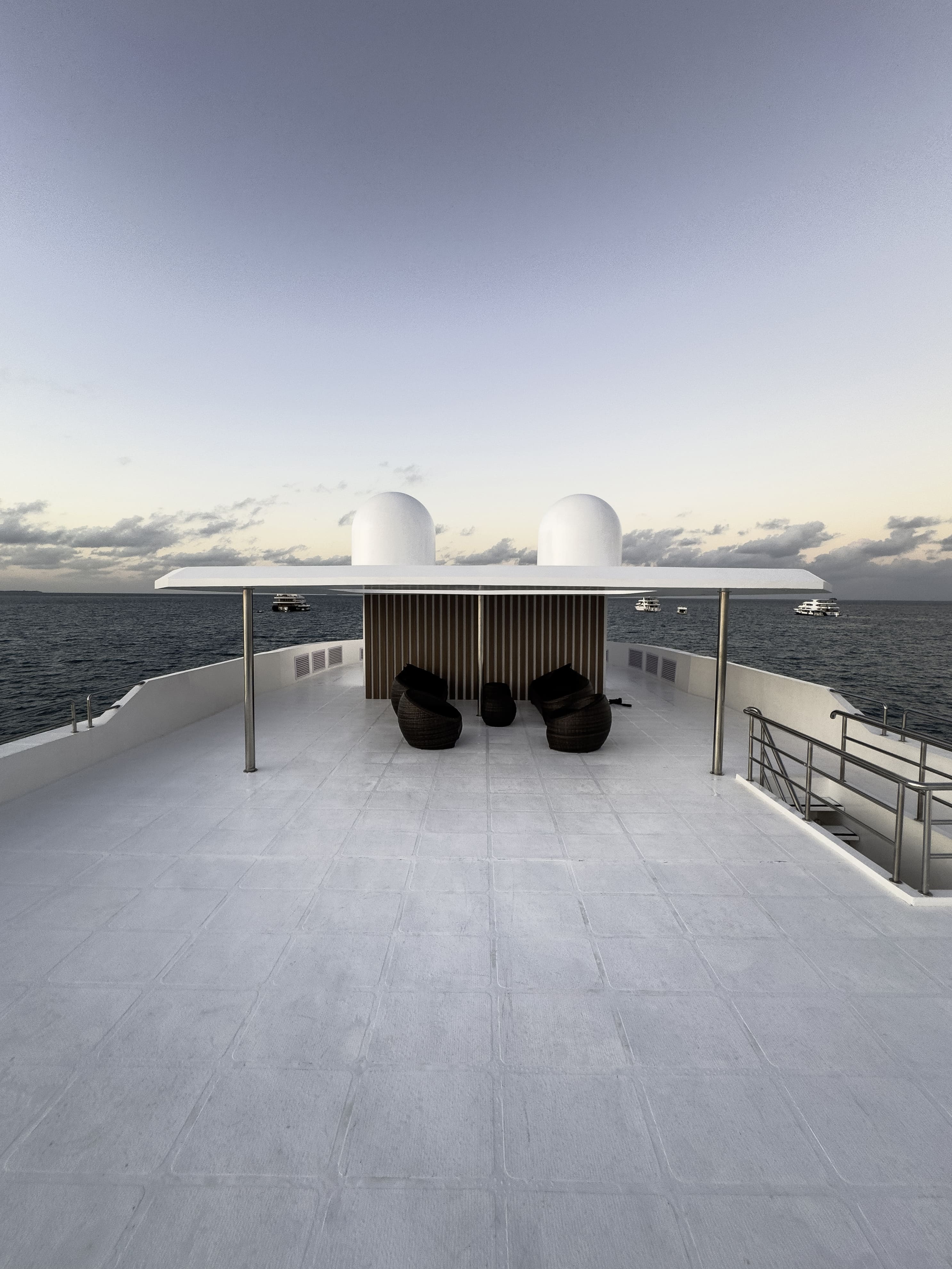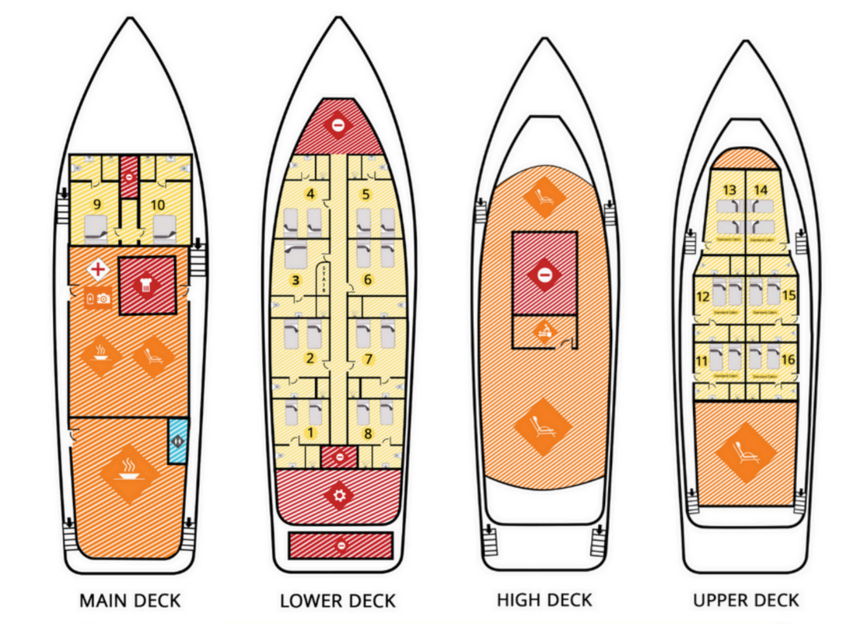 Гості можуть насолоджуватися трапезами на відкритому повітрі, милуючись океанськими краєвидами, або відпочити на сан-деку з масажем під лагідним мальдівським сонцем. Усередині яхти облаштовано затишний коктейль-лаунж для спілкування та зал для розваг, де можна подивитися фільм або пограти у настільні ігри. Сан дек запрошує поніжитися у теплих променях сонця та відчути справжню свободу.