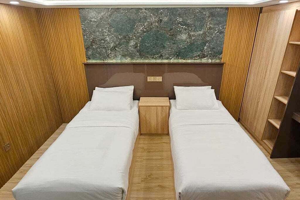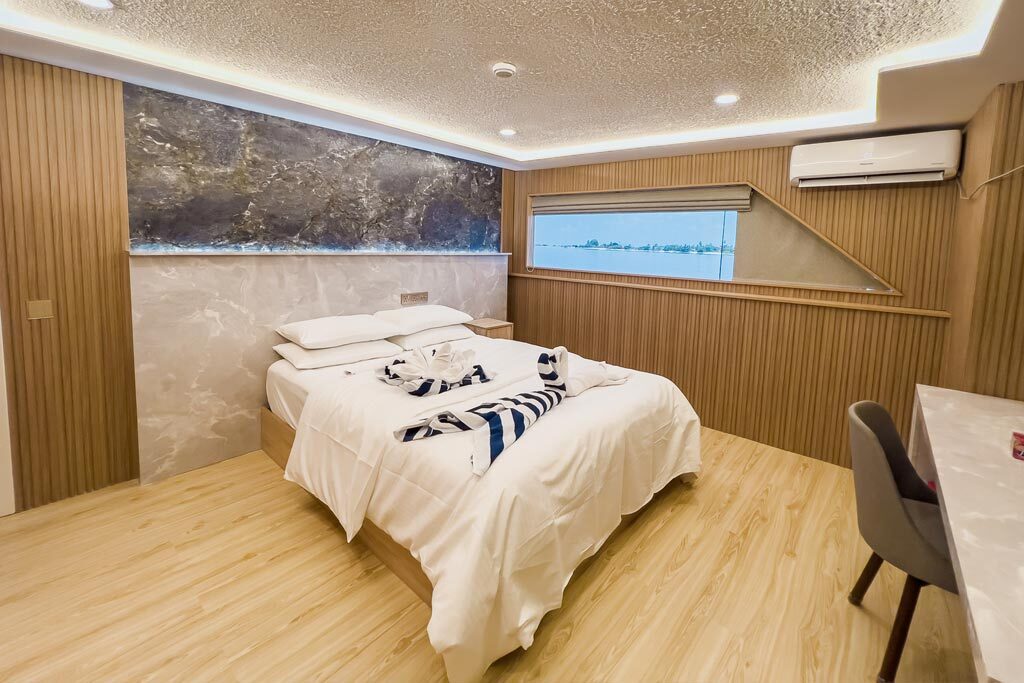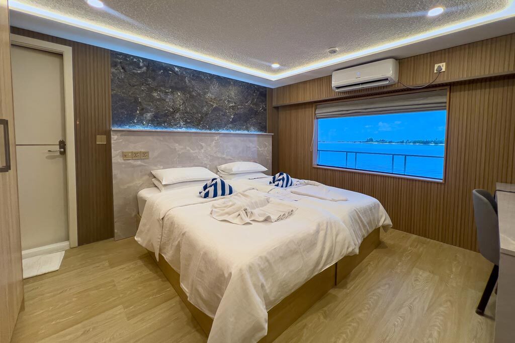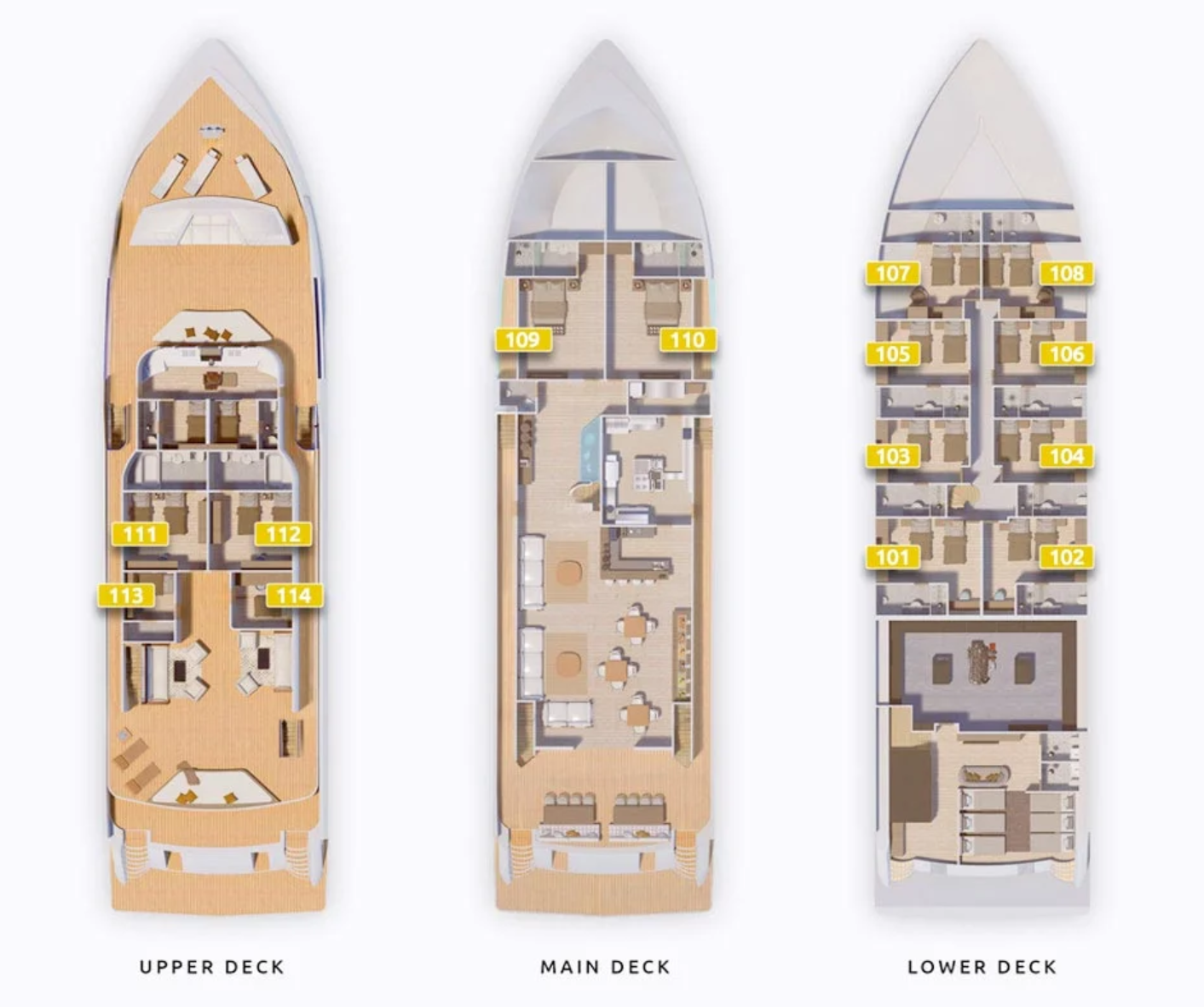 Яхта вміщує до 26 гостей, пропонуючи різні типи кают: дві просторі каюти з двоспальним ліжком, десять кают з двоспальними або окремими ліжками та дві одномісні каюти. Усі вони обладнані всім необхідним для відпочинку після насичених днів дайвінгу.