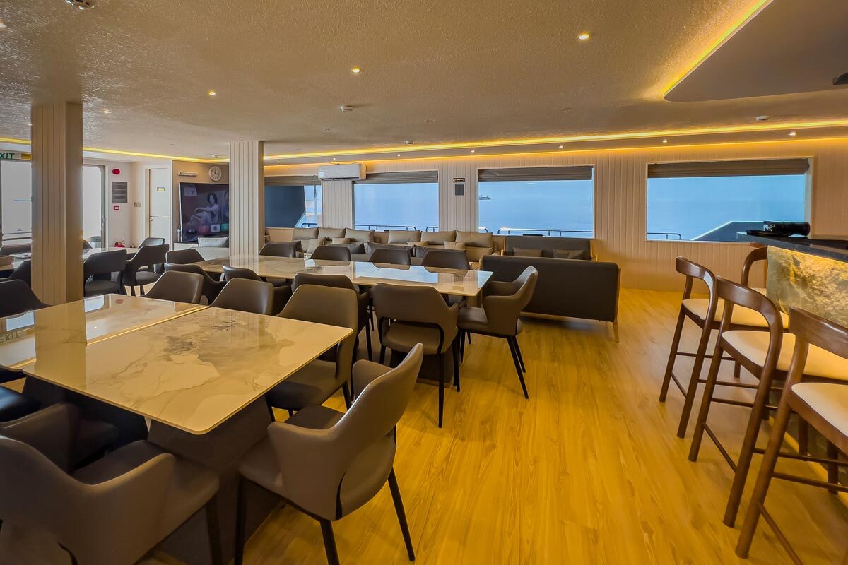 На борту розташовані ресторан, бар, кондиціонований лаунж, а також джакузі під відкритим небом. Для гостей передбачені численні зони для відпочинку на свіжому повітрі: затінена лаунж-зона на середній палубі, оглядові майданчики на носі середньої та верхньої палуб, простора відкрита тераса на верхній палубі, а також окрема зона ocean deck на кормі яхти, звідки можна милуватися хвилями, майже торкаючись води.