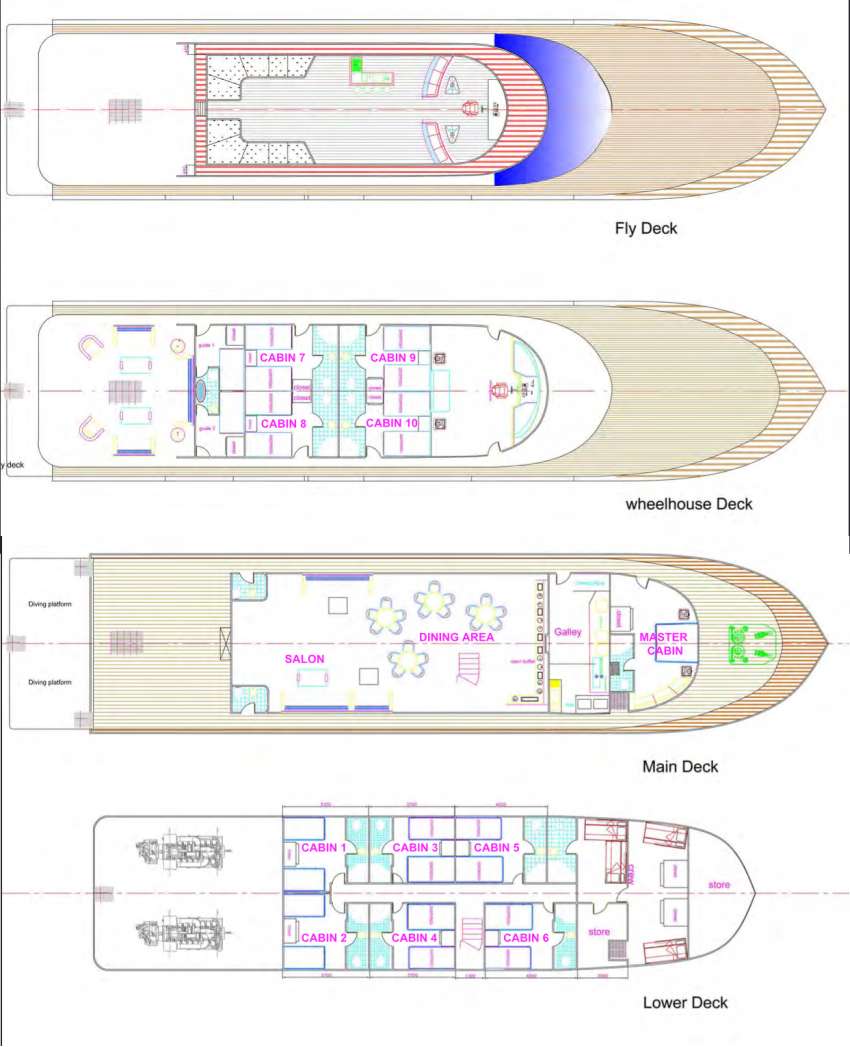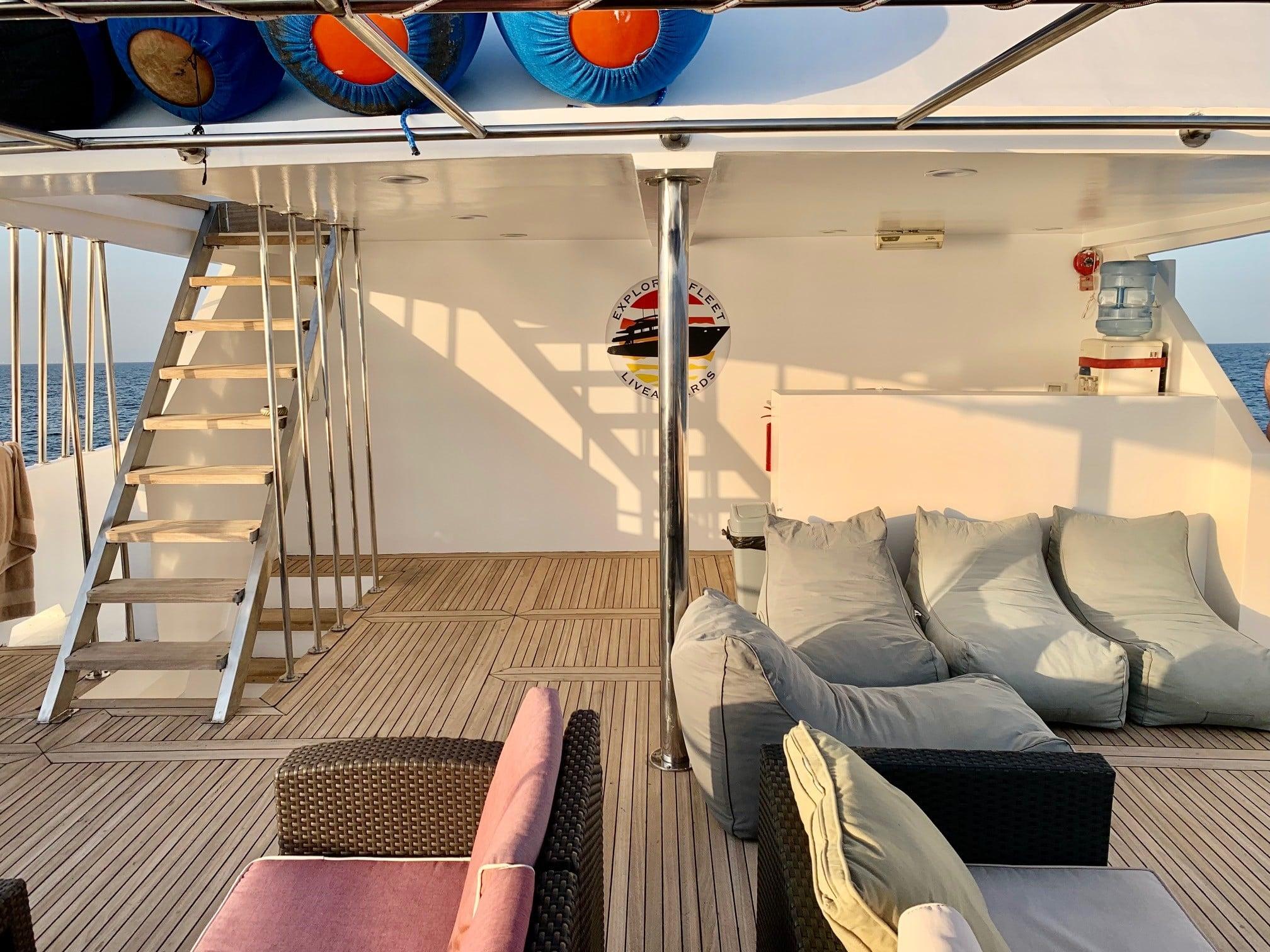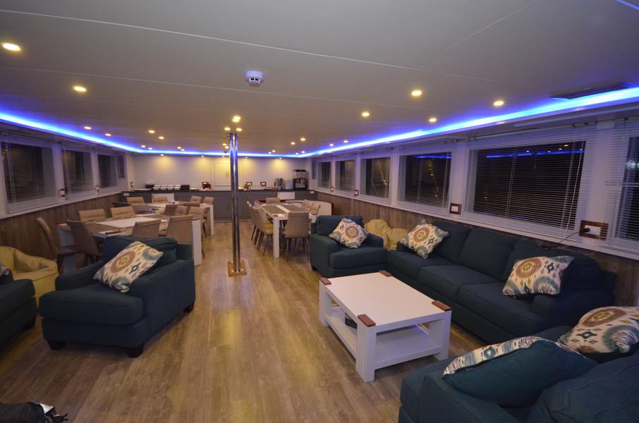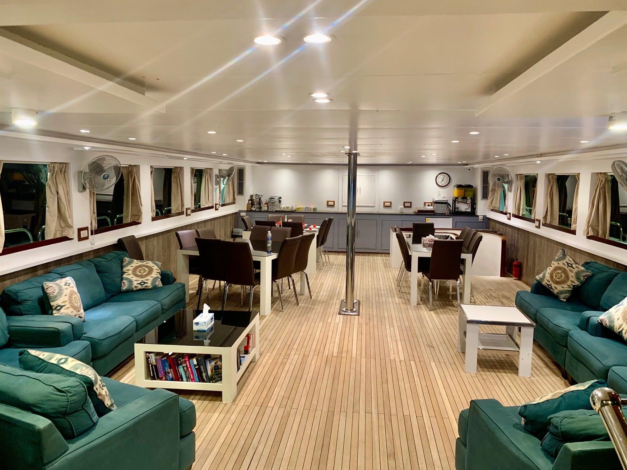 На главной палубе находится уютный салон, а также обеденная зона. Гостям предлагается трехразовое питание и бесплатные безалкогольные напитки. На верхней палубе и сан-дэке есть две лаунж-зоны на открытом воздухе, где можно отдохнуть между погружениями и позагорать.