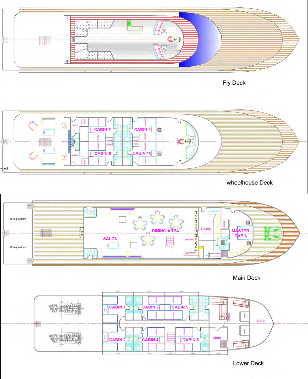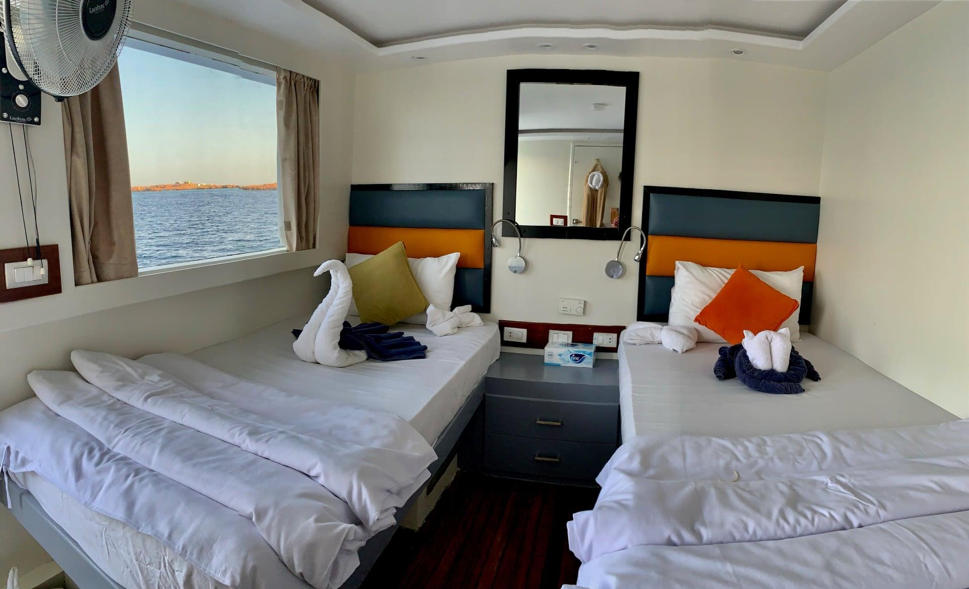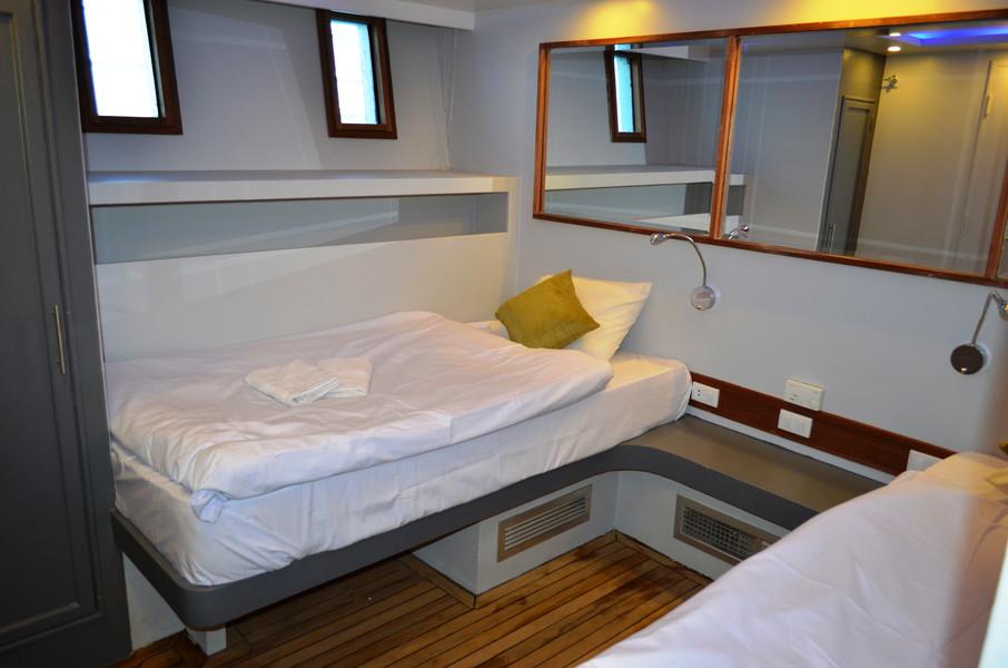На нижней палубе расположено 6 двухместных кают, на верхней - четыре. Все эти каюты имеют две отдельные кровати. На главной палубе расположена каюта Master площадью 20 кв.м. с панорамным видом на море. В ней находится большая двуспальная кровать, телевизор, письменный стол и мини-бар. Все каюты оснащены бесшумной системой кондиционирования, отдельной ванной комнатой с тропическим душем, лампами для чтения и розетками для зарядки гаджетов.